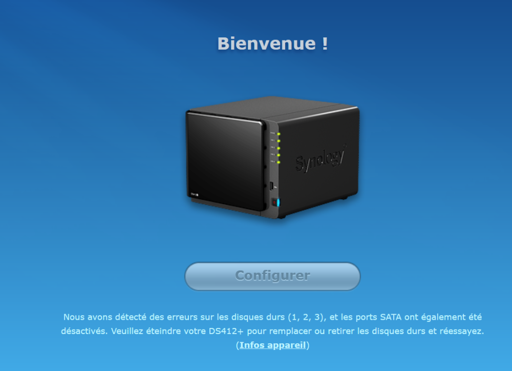 2. Hello, Petit soucis sur mon 412+ , Hier soir j'ai recu 2 mail d'alertes car mon NAS en CMS a eu un petit souci : Le groupe de stockage 1 sur NAS est dégradé[3/4] Le groupe de stockages 1 sur NAS est dégradé (nombre total de disques : 4 ; nombre de disques actifs : 3). Puis quelques minutes après un 2eme mail : Le groupe de stockages 1 sur NAS a planté. J'ai donc essayé de joindre l'interface, impossible, je suis donc passé par l'assistant et là .. : Nous avons détecté des erreurs sur les disques 1,2 et 3 et les ports sata ont également été désactivés Je doute quand même que mes 3 disques aient laché en meme temps, marque différentes, data achat differente. Actuellement il n'y a que la LED du disque 4 qui est allumée, mais ca 'gratte'. Que ce qui est préconiser pour éviter de perdre les data ? Je peux aller plus loin dans Assistant, pour réinstaller DSM (sans perte de data?) ou il faut que j'attende que le NAS se répare ? ou bien encore jouer a plouf plouf pour savoir quel disque est HS, si c'est bien juste 1 disque