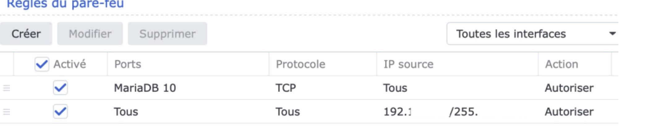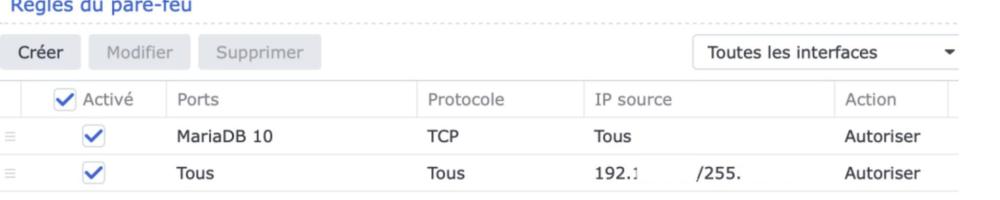 6. Pour commencer, il ne faut pas permettre à DSM d'écrire dans le parefeu. S'il vous le propose lors de l'installation d'une application, vous en prenez note et vous refusez. C'est vous et vous seul qui devez gérer le parefeu. En effet, il arrive que certaines règles automatiques viennent en contradiction d'autres et ça devient rapidement le bazar (ce que vous avez). Ne mettre que votre ip est bien entendu possible mais bien trop restrictif car les autres usagers de votre réseau privé risquent de se faire bloquer alors que le risque d'attaque venant de ce réseau est faible à nul, à moins que vous n'ayez aucune confiance en votre famille ou vos amis. Et si votre IP change, la règle devient caduque. Vous devez autoriser au moins la plage d'adresse de votre réseau privé (par exemple 192.168.x.0/24) à utiliser tous les ports. Vous pouvez aussi la réduire, selon votre besoin. C'est votre choix. S'il y a d'autres applications utilisant d'autres plages privées (VPN, Docker entre autres), il faut aussi mettre en place des règles pour ces plages. Ceci est clairement expliqué dans le tuto. Je ne vois pas de ligne tous dans vos captures. Ce qu'il faut c'est une règle en toute dernière ligne du profil pour tous les protocoles, tous les ports et toutes les IP qui refuse le trafic. C'est obligatoire pour ne pas avoir un parefeu qui ne sert...à rien. Le parefeu n'a rien à voir avec le système, DSM en l’occurrence. Il ne gère que le trafic rentrant. Donc, si vos requêtes externes ont besoin de maria db, alors oui, il faut l'autoriser. C'est vous qui devez définir quelle application ou quel service doit être joignable de l'extérieur étant bien entendu que le trafic local n'est lui pas limité grâce aux règles du réseau privé énoncées ci-dessus.