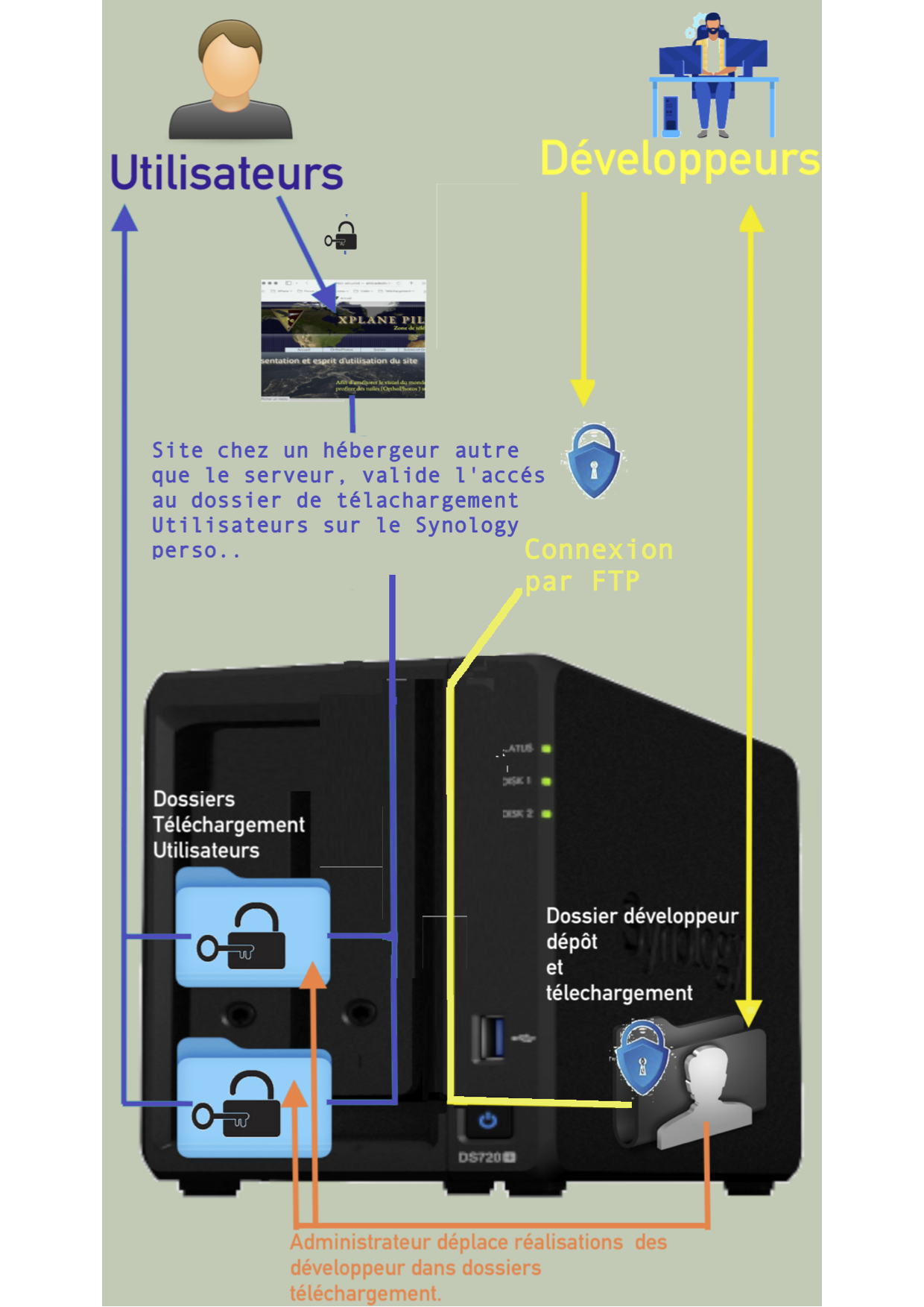 3. Bonjour Merci pour les réponses Je suis le seul en privé qui se connecte au serveur en local. Aucun autres appareils de ma femme ne s'y connecte si ce n'est le iPad pour valider la double authentification. Par contre peut être que si l'IP de mon mac est bloqué il serait prudent que je rentre aussi le numéro Local IP du mac de ma femme pour débloquer mon blocage Oui/NOn ? Pas de VPN . Peut être que pour protéger mon serveur il faudrait le mettre en place. Mais je ne sais pas si dans ce cas le concept sur mon image ci-dessus comment faire. J'ai mieux expliqué avec une nouvelle image du post précédent le contexte d'utilisation du serveur. Sur un forum en privé par mail vous me demandez un nom d'utilisateur et un mot de passe Vous allez ensuite sur mon site Web chez un hébergeur Une nouvelle page s'ouvre , vous rentrer le nom d'utilisateur et le mot de passe Le site vous propose une nouvelle page. Sur cette page vous sélectionner le dossier à télécharger Un lien de téléchargement sur le site renvoi sur mon serveur dans le dossier téléchargement et vous télécharger le dossier la ligne tous
