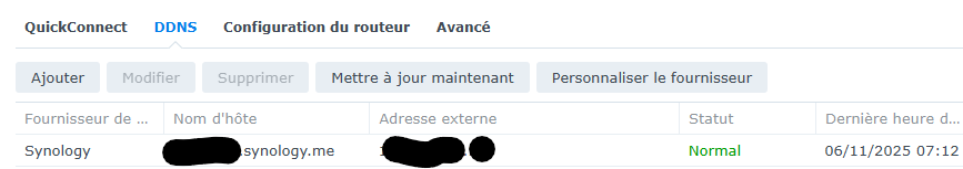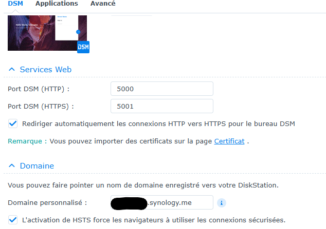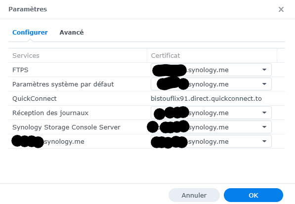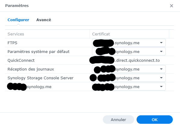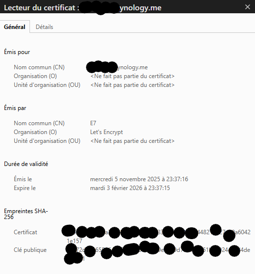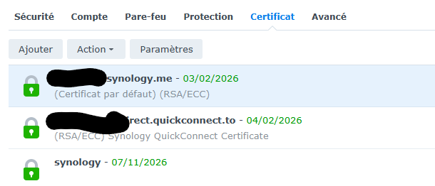 Bonjour à tous, J'utilise un Synology depuis maintenant quelques années et jusqu'à présent je n'avais rencontré aucun problème. j'ai mon domaine synology.me en https de base, aucun problème non plus depuis sa création. seulement voilà, depuis deux jours j'ai traficoté (oui bouh c'est mal quand on connait pas son sujet) et PAF j'ai perdu pas mal de données de config. J'ai décidé de tout remettre à plat et en place. Voilà où j'en suis et le problème que je rencontre. j'ai supprimé mon certificat en cours let's encrypt sur mon nom de domaine initial. j'avais des redirections de ports que j'ai supprimé temporairement pour retrouver déjà une situation normal et ok sur le NAS. J'ai changé mon nom de domaine personnalisé dans DSM via portail de connexion => DSM Toujours dans DSM via portail de connexion => DSM, j'ai bien mes paramètres classiques HTTP : 5000 et HTTPS : 5001 avec redirection automatique des HTTP vers HTTPS coché : j'ai recréé un certificat let's encrypt sur ce nouveau nom de domaine. Certificat valide, en cours jusqu'au 02/26 (certificat par défaut) : j'avais aussi modifié sur Web station (travail sur un site internet hébergé sur mon NAS). Actuellement dessus, j'ai serveur par défaut sur 80/443. Dans Accès externe => DDNS , je retrouve bien mon bon nom de domaine à jour avec mon IP publique correcte et état "normal" donc fonctionnel : coté routeur, j'ai désactivé les redirections de ports que j'avais. Reboot NAS + routeur déjà effectué. Problème : le HTTPS ne veut pas prendre, je ne comprend pas pourquoi. Connexion OK sur http://domaine.synology.me Connexion OK sur http://iplocal:5001 Connexion KO sur https://domaine.synology.me:5001/#/signin (site inaccessible) connexion KO sur https://domaine.synology.me/#/signin (ko c'est a dire que j'arrive a me connecter (redirection auto http vers https) mais ca reste en réalité non sécurisé. sur sécurité et certificat quand je vais sur mon domaine a jour puis paramétres, j'ai bien les différents services affichés qui pointent vers mon bon nom de domaine : Si vous avez des idées je suis preneur car vraiment je ne comprend pas là ou j'ai oublié quelque chose. Bonne journée !