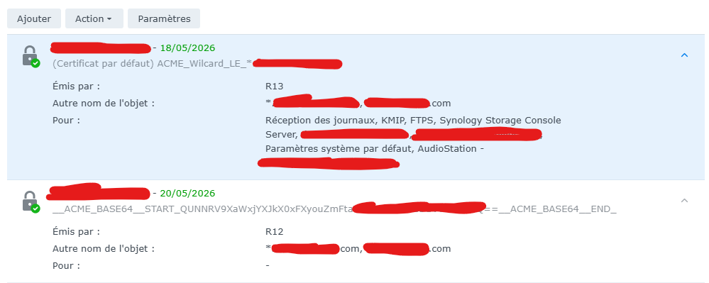 Merci pour la piste. J'ai remplacé dans le script les références à "SAVED_SYNO_Username" et "SAVED_SYNO_Password" par respectivement "SAVED_SYNO_USERNAME" et "SAVED_SYNO_PASSWORD". Le script génère bien les certificats, importe ce qu'il faut mais c'est pas parfait. Voici ce que j'ai dans DSM : Le nouveau certificat est bien importé mais c'est un nouveau certificat : il ne vient pas en remplacement du précédent. Il ne doit pas manquer grand chose. Dans le log, j'ai : Content-Disposition: form-data; name="id"^M ^M ^M ----------------------------20260219133250^M Content-Disposition: form-data; name="desc"^M ^M __ACME_BASE64__START_QUNNRV9XaWxjYXJkX0xFXyouZmFtaaaaaaaaaaaaaaaaaaaaaa==__ACME_BASE64__END_^M ----------------------------20260219133250--^M ' [Thu Feb 19 14:32:50 CET 2026] _postContentType='multipart/form-data; boundary=--------------------------20260219133250' [Thu Feb 19 14:32:50 CET 2026] Http already initialized. [Thu Feb 19 14:32:50 CET 2026] _CURL='curl --silent --dump-header /usr/local/share/acme.sh/http.header -L --trace-ascii /tmp/tmp.XJtSsmKMTi -g ' [Thu Feb 19 14:32:50 CET 2026] _ret='0' [Thu Feb 19 14:32:50 CET 2026] Restart HTTP services failed. [Thu Feb 19 14:32:50 CET 2026] GET [Thu Feb 19 14:32:50 CET 2026] url='http://localhost:5000/webapi/entry.cgi?api=SYNO.API.Auth&version=7&method=logout&_sid=NPKQ39v-iicT-nhFTaSlQruGEF3SqkWI3WaOKCnbC7k-vplS8y5MLB-5xRrDyHFLs1rwtSaV-BsNByHmbmyBYU' [Thu Feb 19 14:32:50 CET 2026] timeout= [Thu Feb 19 14:32:50 CET 2026] Http already initialized. [Thu Feb 19 14:32:50 CET 2026] _CURL='curl --silent --dump-header /usr/local/share/acme.sh/http.header -L --trace-ascii /tmp/tmp.XJtSsmKMTi -g ' [Thu Feb 19 14:32:50 CET 2026] ret='0' [Thu Feb 19 14:32:50 CET 2026] Success [Thu Feb 19 14:32:50 CET 2026] Return code: 0 [Thu Feb 19 14:32:50 CET 2026] _error_level='2' [Thu Feb 19 14:32:50 CET 2026] _set_level='2' [Thu Feb 19 14:32:50 CET 2026] The NOTIFY_HOOK is empty, will just return. [Thu Feb 19 14:32:50 CET 2026] ===End cron=== Quand il l'importe les nouveaux fichiers, il ne reprend pas la bonne description du certificat. (flux "desc") Je me retrouve avec 2 certificats de même noms avec 2 descriptions différentes (un en clair et l'autre encodé en base 64). Sinon pour répondre à la question, j'ai bien Container Manager sur le NAS mais la solution tache planifiée me semble plus simple à mettre en œuvre. Je vais peut-être me résoudre à regarder ce lien si personne ne trouve d'où vient le problème. GitHubSynology NAS GuideA pure Unix shell script ACME client for SSL / TLS certificate automation - acmesh-official/acme.sh Merci.