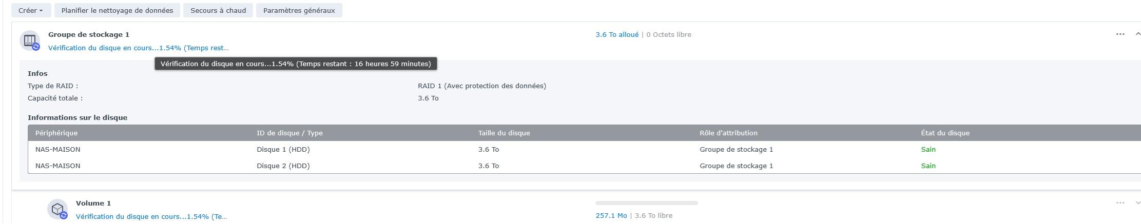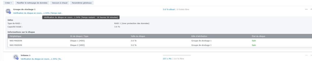 2. Bonjour, ou bonsoir, suivant à l'heure que vous lisez ceci ! Je viens d'aquérir un NAS pas une fusée mais pour ce que j'en ai a faire çà suffiras c'est un DS218J j'ai 2 HDD de 4To que je suis en train de mettre en RAID1 donc j'ai crée un groupes de stockage pour le Mirroiring sauf que apres un temps il m'indique 15h pour une vérification des disques apres là première phase c'est normal ? Merci à vous pour les éventuels réponses Cordialement Absolum