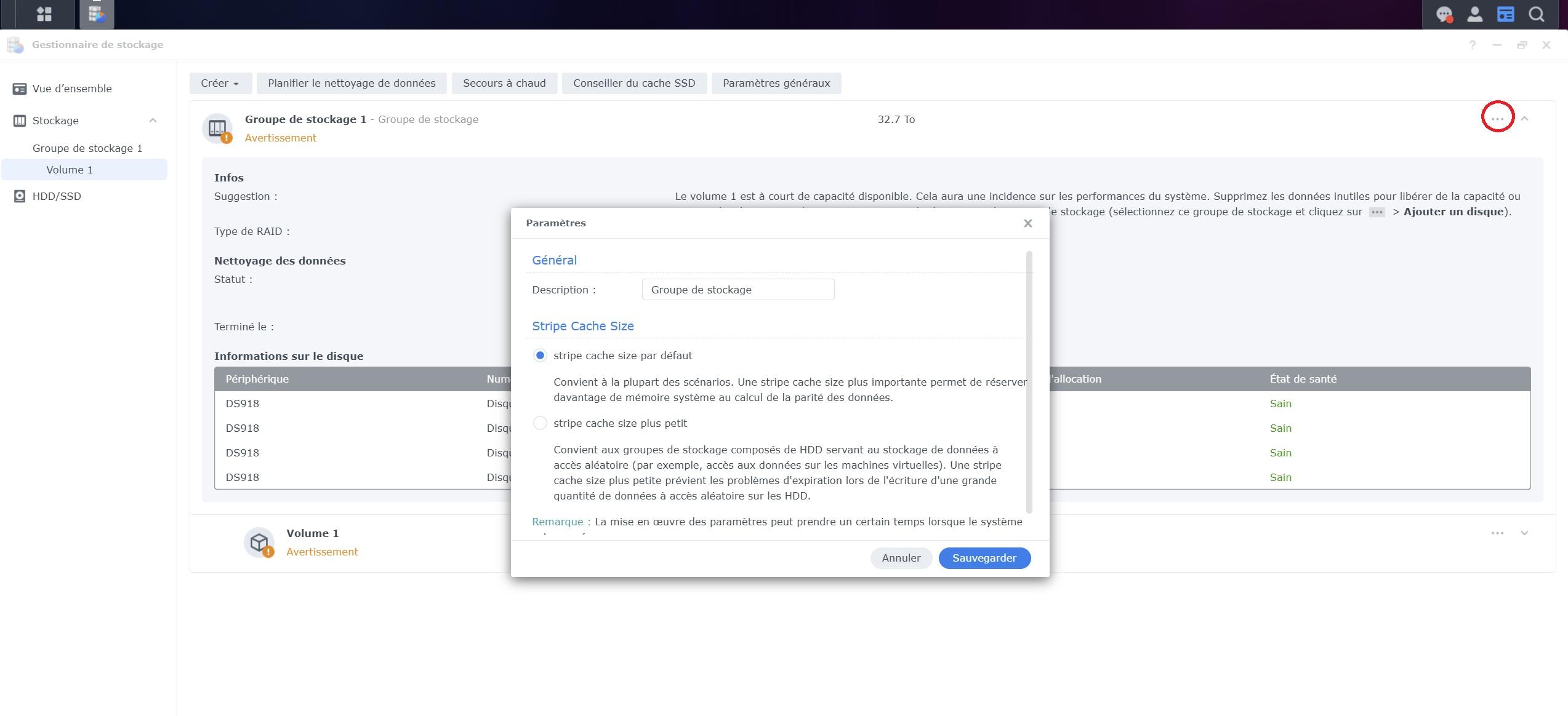 Bonjour et merci de me répondre. J'ai donc un seul groupe qui contient mes 4 disques. Je suis en RAID5 (Avec protection des données), mais pour le format je ne sais pas car je ne me souviens plus comment je les avais formatés. EDIT : je viens de trouver BTRFS. Oui, j'ai bien des "Attributs SMART" mais je ne vois pas comment les exporter. Pour les "données SMART" j'ai exporté en HTML l'historique et toutes les lignes ont "Sain". Merci de m'aider à vous fournir les informations dont vous avez besoin pour m'aider -