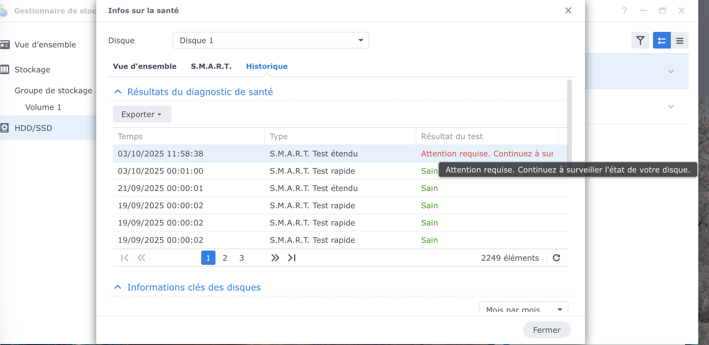 Normalement, en cliquant sur l'onglet SMART, vous devriez pouvoir consulter le détail du test. C'est dans Attribut SMART, bouton détail. Cette fonction est toujours disponible dans DSM7.1.1. Vous l'avez forcément. Vous n'avez pas répondu à propos des tests à 90% -