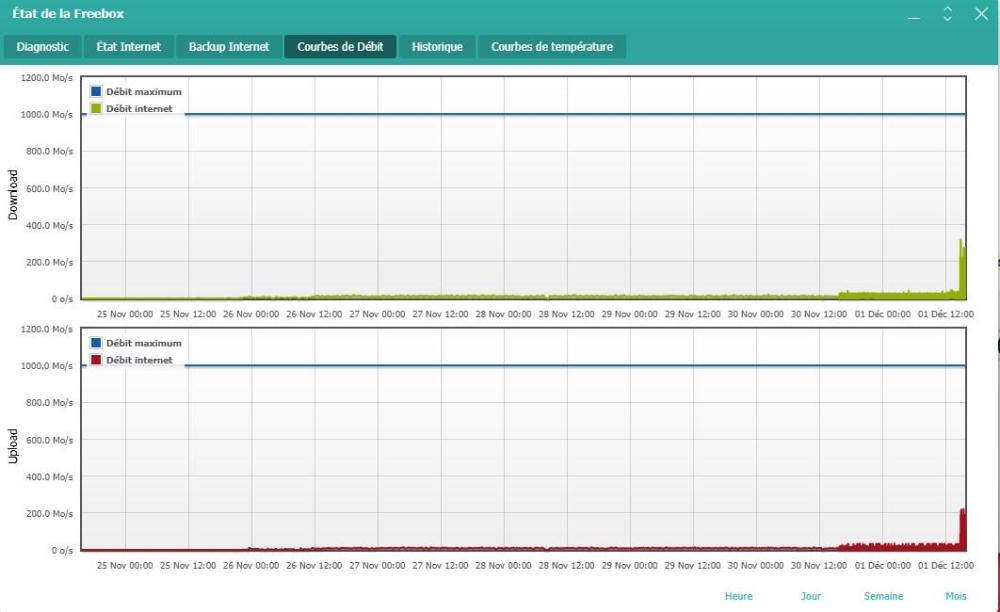 6. Si tu sélectionnes [Mois] en bas à droite, ce sera déjà plus parlant que la dernière heure. Je ne comprends vraiment pas l'intérêt de faire de tels tests de débit. Tu choisis délibérément de pourrir ta connexion internet toutes les 5 minutes, ainsi que celle d'autres abonnés au même opérateur (car il ne faut pas oublier que c'est mutualisé).