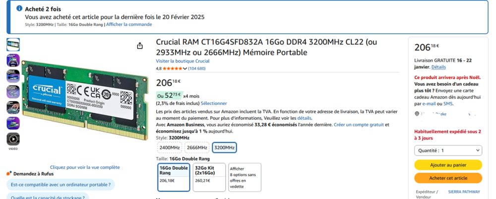 Bonjour Le prix de la mémoire a flambé depuis le début de l'année. En février, j'avais acheté 32 GB pour 76 €, et maintenant, 11 mois plus tard, le prix est de 206 €, une augmentation de 200 % . La mémoire va bientôt coûter plus cher que la machine elle-même.