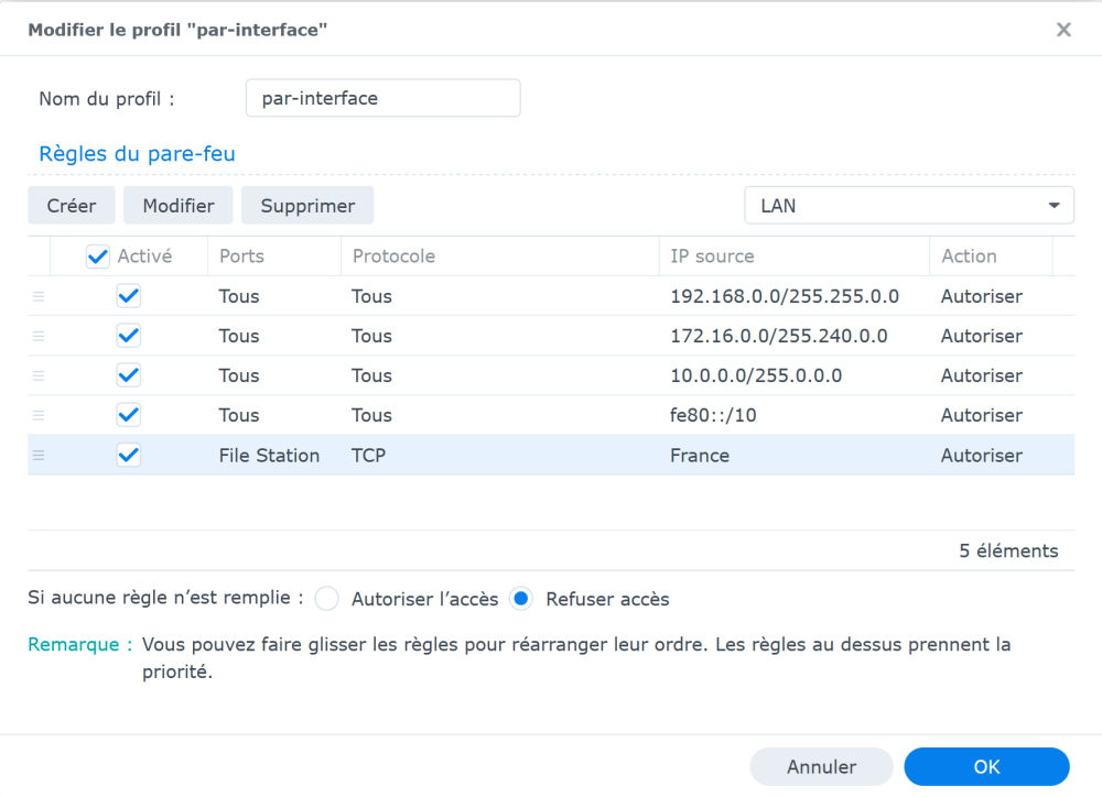 Bonjour, Je suis néophyte en installation de NAS, après avoir suivi le tutoriel, actuellement en connexion à distance, je n'arrive pas à activer la connexion DDNS. (page introuvable) Tentative de connexion infructueuse : https://ndd.synology.me:7001/ Dans l'onglet accès externe : - DDNS, je vois bien mon nom de domaine ainsi que le statut normal. - Avancé, j'ai bien le nom d'hôte ndd.synology.me les deux autres lignes ne sont pas complétées. Dans l'onglet portail de connexion : - Applications => File Station => Domaine : ndd.synology.me & Https : 7001 Enfin pour le pare-feu, cf image Sauriez-vous me conseiller pour trouver la cause de ce blocage ? Merci d'avance, Quentin B.