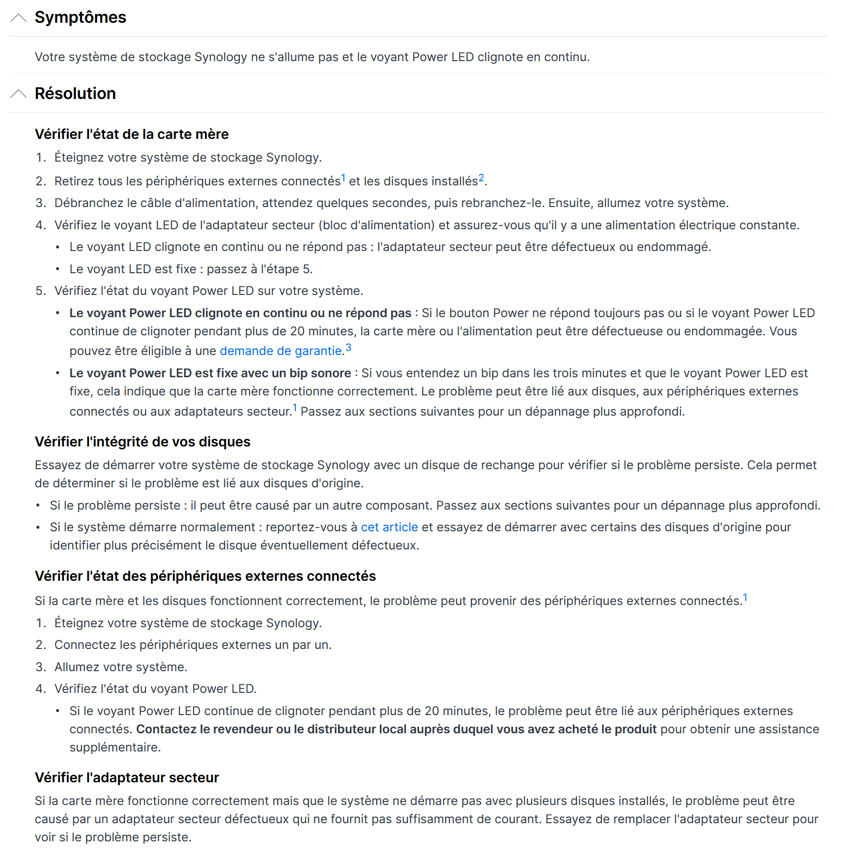 6. Bonjour @JeanSimon , Fait un test de la carte mère, ici https://kb.synology.com/fr-fr/DSM/tutorial/Why_am_I_unable_to_install_my_Synology_NAS_and_why_is_my_power_LED_is_flashing_constantly Ensuite je te conseille de tester ton onduleur, pour cela tu le mets en charge ( seul rien dessus ) quelques heure puis tu branches dessus un lampe par exemple. Ensuite tu débranche la prise de courant de celui-ci la lampe dois rester allumé quelques minute. Si c'est pas le cas remplace la batterie de celui-ci. Autre point quand je vois la photo de ton nas profite en pour souffler la poussière qu'il y a dedans aussi. Pour ma part j'ai programmé mes onduleurs sur un temps coupure ( exemple 5 ou 2 minutes )