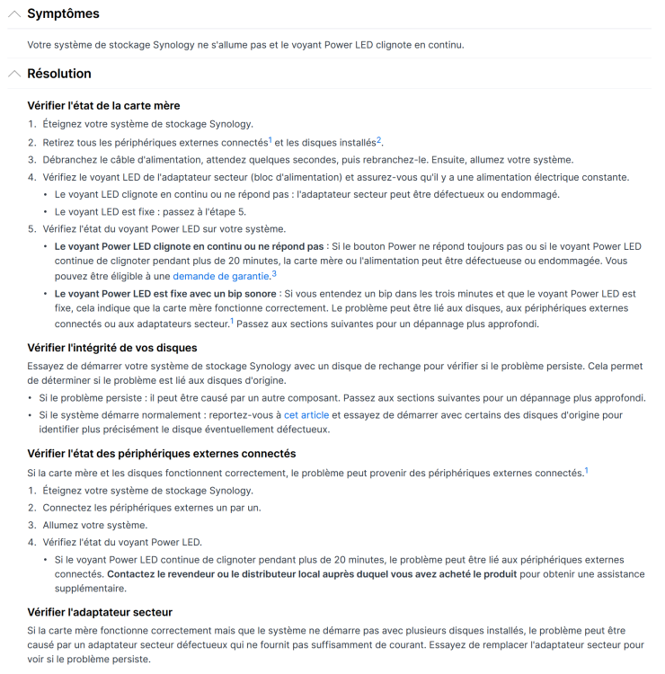 5. Bonjour @firlin , Merci pour le retour. C'est effectivement une des pages sur lesquelles j'étais tombé dans mes recherches et je ne passe pas l'étape 5. Le bloc secteur est bien vert fixe mais le Power du NAS continue à clignoter même après 20 minutes. J'ai d'ores et déjà commandé une nouvelle alimentation qui devrait arriver dans 2 jours. J'avais espoir que ce soit quelque chose que je peux régler plus rapidement mais ça n'a pas l'air... J'ai testé mon Onduleur il y a quelques semaines de mémoire (moins de 2 mois en tout cas) et je sais qu'il fonctionnait. D'ailleurs je l'avais fait avec toute mon installation branchée dessus (PC + NAS + Switch) et il avait tenu au moins quelques minutes. Je sais cependant que la batterie ne doit pas être loin d'être HS (depuis 2012 ce serait pas étonnant) et j'avais prévu de le remplacer par un autre avec un écran et un port RJ45 (mon actuel est un EATON Elipse Eco 1200 et le APC Back-UPS PRO 900 me parle bien). C'est dans mes projets 2026. C'est d'ailleurs pour ça que j'avais préféré programmer l'extinction sur un % de batterie plutôt qu'une valeur fixe de temps vu que je ne suis pas certain de ce dont il est capable niveau temps. Ah oui et j'ai branché le NAS sur une prise murale directe pour le test aussi et le résultat est le même. D'habitude je passais rapidement dessus avec l'aspirateur quand je passe un coup chez moi mais là j'en ai profité pour ressortir la soufflette vu qu'il me restait encore un peu de gaz dedans. Il en est effectivement sorti des choses, que je ne pensais pas qu'elle pouvait avoir élu résidence dedans ! Il va beaucoup mieux maintenant et j'vais en profiter pour me commander une souffleuse électrique. Ça fait trop longtemps que j'aurais du m'équiper de ce genre de chose. Merci pour tous tes conseils. Visiblement je n'ai pas d'autre choix que d'attendre l'arrivée de l'alimentation et de tester avec c'est ça ? WhatsApp Video 2026-01-06 at 17.55.46.mp4 Petite correction, comme maintenant le NAS est débranché, j'ai récupéré le câble USB de mon onduleur, que j'ai rebranché à mon PC pour avoir ses infos. Bon je suis un peu surpris de ce qu'il me raconte mais je vais le croire sur parole pour l'instant. Par contre il n'a plus rien en mémoire comme évènements. Ça doit être à cause de la coupure.