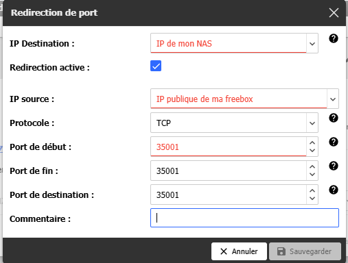 Merci beaucoup ! Je comprends où je bloque, c'est au niveau de la redirection du port de ma freebox. J'ai ça : Le problème c'est que je suis paumé sur port début et port de fin car port de début c'est minimum 16384 et maximum 32767 sur le port début... or, mon port https c'est 35001 (je peux modifié pour autre chose, mais je préfère éviter de tout changer.) edit : même si je change mes ports d'accès DSM pour 25001, ca ne change malheureusement pas grand chose...