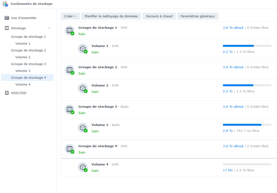 2. Bonjour, Bien que ce forum comporte beaucoup de sujet concernant l’installation de nouveaux disques, je n’ai pas trouvé de réponses à mon cas. J’ai ajouté un nouveau disque (WD40EFPX-68C6CND pro NAS). Je ne parviens pas à le détecter dans le programme « File Station » ainsi que mon « Explorateur Fichiers »de me mon PC. Mon appareil DS418 comporte 4 emplacements et sont maintenant tous occupés par des disques de 4To. Un disque Seagate et trois WD. Version DSM 7.3. Le « Gestionnaire de stockage » m’indique ceci : · Tous les disques ont le statut de Santé « Sain » et se trouvent dans un « Groupe de stockage » séparés, montés en « Hybride RAID (SHR) (Sans protection de données) · Mon nouveau disque indique « 17 Mo occupé et 3,5 To libre ». Alors la question est : est-ce que j’ai oublié une opération de paramétrage ou autre ? Peut-être un de vous m’aider dans mon problème ? Merci d’avance et bon dimanche.
