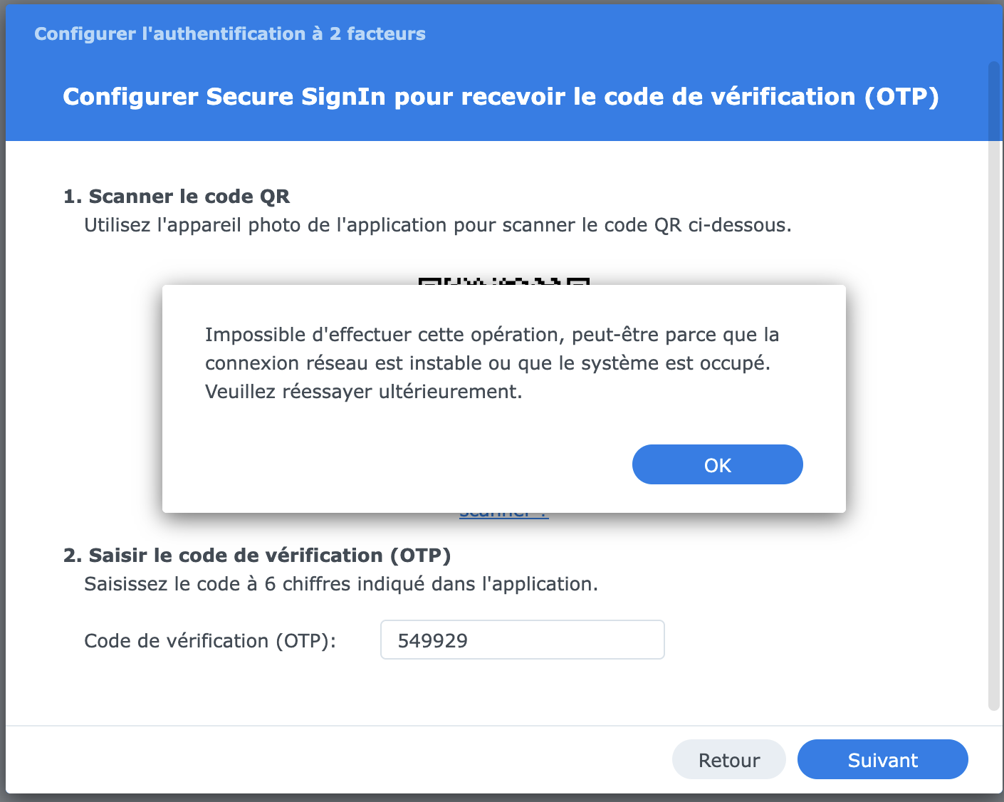 Bonjour, J'ai activé 2FA sur mon NAS. J'ai téléchargé l'application Secure Signin sur mon téléphone. L'application reconnait mon compte, je charge mon code sur OTP et à partir de là je suis bloqué. Je ne parviens plus à me connecter au NAS. J'obtiens un message "Impossible d'effectuer cette opération". Comment faire ? Merci de vos conseils ! -