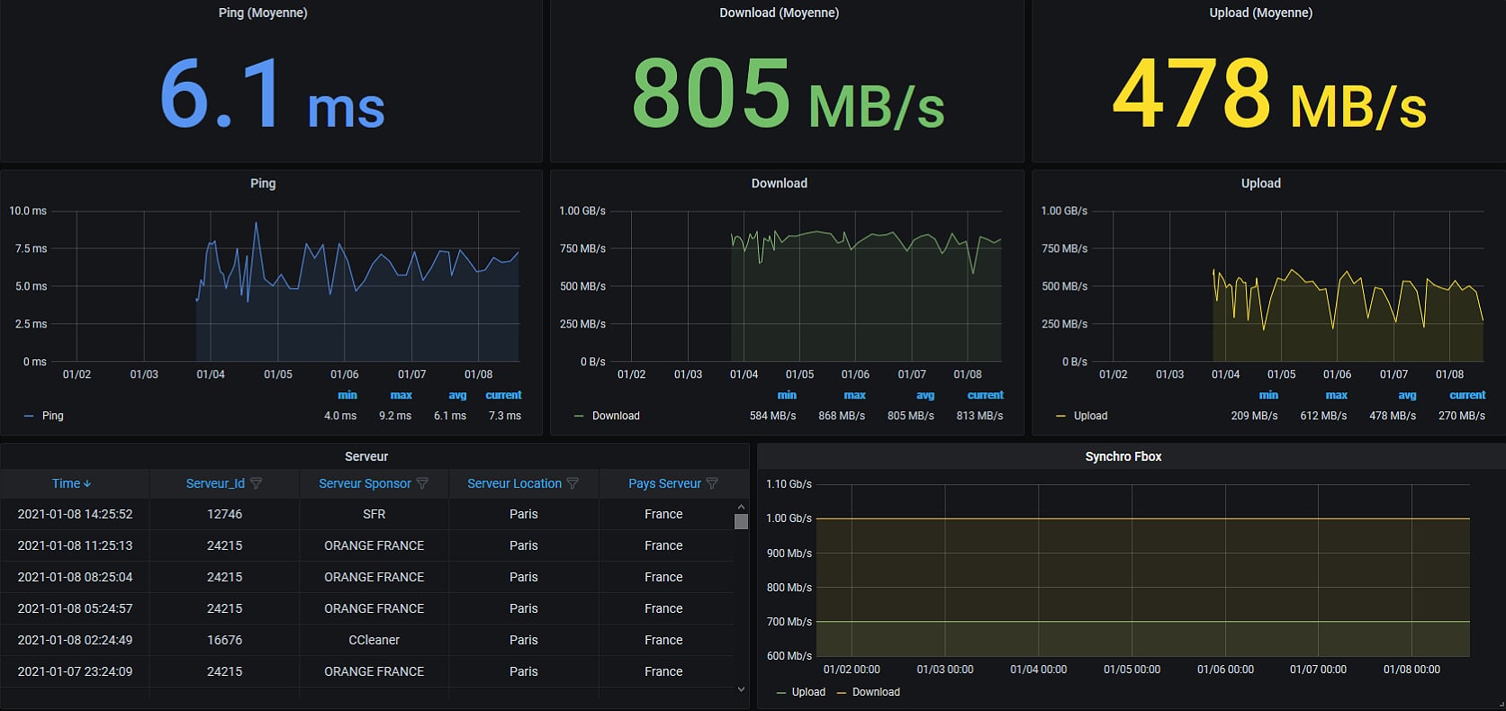 Il s'agit ici de présenter un tuto pour monitorer sa Freebox, avec les outils telegraf / influxdb / grafana, en complément du [TUTO] Monitoring NAS et Réseau qui reste la référence. En conséquence, je suppose déjà opérationnelle chez vous une chaine complète telegraf / influxdb / grafana pour la supervision de votre NAS Il faudra bien entendu faire les adaptations spécifiques à votre environnement. Principe : Le docker telegraf va utiliser un script python pour récupérer les infos de la Freebox. Limites : je n'ai pu valider cette méthode que sur ma Freebox, et donc pour les autres modèles et/ou configuration ... ? Freebox Révolution au dernier Firmware (4.0.7) à ce jour. Accès réseau fibre ftth (et donc pas testé les compteurs xDSL) Chaine existante (hypothèse) : je suppose donc que vous avez une chaine telegraf / influxdb / grafana opérationnelle pour votre NAS, en docker mode bridge. Ajout Freebox : On va rajouter un second docker telegraf, qui portera le script Python. Ce docker telegraf dédié Freebox va transmettre ses données vers une seconde database que l'on va créer dans le docker Influx Sur grafana, on créera une nouvelle source de données (la nouvelle database d'influx) qui nous permettra d'afficher les données Freebox. Voir schéma de principe ci-dessous : Configuration des dockers existants : subnet: 172.20.0.0/29 gateway: 172.20.0.1 ip_range: 172.20.0.0/29 Adressage existant grafana d2:ca:ab:cd:00:02 172.20.0.2 influxdb d2:ca:ab:cd:00:03 172.20.0.3 nas_telegraf d2:ca:ab:cd:00:04 172.20.0.4 Création du nouveau docker : fbx_telegraf Adressage sur le réseau bridge : fbx_telegraf d2:ca:ab:cd:00:05 172.20.0.5 Déclaration du service fbx_telegraf dans le docker-compose.yaml (extrait): EDIT du 02/septembre 2020 : la dernière branche de developpement du docker telegraf, 1.15.x, semble poser problème avec Python. Il faut donc se limiter au max à la version 1.14.5. L'image à charger sera donc telegraf:1.14.5 au lieu de telegraf:latest EDIT du 08/septembre 2020 : installation résolue pour python sur la branche telegraf 1.15.x (i.e. tag : latest). Voir détails plus bas. services: fbx_telegraf: image: telegraf:latest container_name: fbx_telegraf hostname: fbx_telegraf mac_address: d2:ca:ab:cd:00:05 networks: monitoring: ipv4_address: 172.20.0.5 environment: - PATH=/usr/local/sbin:/usr/local/bin:/usr/sbin:/usr/bin:/bin:/sbin:/usr/local:/usr/src - TZ=CET mem_limit: 75M volumes: - "/volume1/docker/monitoring/fbx_telegraf/telegraf.conf:/etc/telegraf/telegraf.conf:ro" # pour le fichier de commande python d'acces a la freebox, # pour le fichier de commande python, # pour le fichier get-pip.py (install module pip puis requests) - "/volume1/docker/monitoring/fbx_telegraf/py:/usr/local/py" # pour le fichier log si on le met en place - "/volume1/docker/monitoring/fbx_telegraf/log:/usr/local/log" ports: - 9125:8125/udp - 9092:8092/udp - 9094:8094 restart: unless-stopped On notera la création et le mapping de 2 répertoires pour le docker fbx_telegraf: un répertoire pour le fichier Python et le fichier d'installation de l'utilitaire python "pip" : /usr/local/py un répertoire pour d’éventuels logs : /usr/local/log Création et démarrage du docker fbx_telegraf: docker-compose pull fbx_telegraf docker-compose up -d fbx_telegraf Via un accès ssh sur le NAS : mise à jour du docker fbx_telegraf docker exec -it fbx_telegraf apt update docker exec -it fbx_telegraf apt upgrade docker exec -it fbx_telegraf apt install -y software-properties-common Installation de python3 dans le docker telegraf télécharger get-pip.py (https://bootstrap.pypa.io/get-pip.py) dans le répertoire /usr/local/py installation des modules pip et requests docker exec -it fbx_telegraf wget https://bootstrap.pypa.io/get-pip.py docker exec -it fbx_telegraf python3 get-pip.py --prefix=/usr/local docker exec -it fbx_telegraf python3 -m pip install requests docker exec -it fbx_telegraf pip install unidecode EDIT du 08/septembre 2020 : installation Python sur la branche telegraf:1.5.x (i.e. tag latest) Au lieu des 7 commandes ci-dessus, on procèdera de la sorte : docker exec -it fbx_telegraf apt update docker exec -it fbx_telegraf apt upgrade docker exec -it fbx_telegraf dpkg --configure -a docker exec -it fbx_telegraf apt-get install apt-transport-https ca-certificates curl gnupg-agent software-properties-common docker exec -it fbx_telegraf wget https://bootstrap.pypa.io/get-pip.py docker exec -it fbx_telegraf apt-get install python3-distutils docker exec -it fbx_telegraf python3 get-pip.py --prefix=/usr/local docker exec -it fbx_telegraf python3 -m pip install requests docker exec -it fbx_telegraf pip install unidecode Il se peut que vous ayez une erreur du type : E: dpkg was interrupted, you must manually run 'dpkg --configure -a' to correct the problem Dans ce cas, .... suivre à la lettre la consigne et lancer donc la commande # dpkg --configure -a . Puis poursuivre normalement Script Python : On place le script Python fbx_telegraf_059.py dans le répertoire /usr/local/py (ce script a été mis à jour pour mes propres besoins. N’hésitez pas à le reprendre, en particulier en fonction de l'API Freebox si il vous manque des éléments) EDIT du 27/04/2021 : mise à jour du fichier python en version ed061. version basée sur l'API V8 de FreeboxOs compatibilité avec Freebox POP je conseille de repartir d'une database InfluxDB vierge cf message en page 9 pour plus de détails c'est par ici : https://github.com/bruno78310/Freebox-Revolution-Monitoring.git Modification du fichier de configuration telegraf : 1) Dans la section "Input Plugin" : ############################################################################### # INPUT PLUGINS # ############################################################################### ############################################################################### # INPUT PLUGINS FREEBOX # #######################################################################