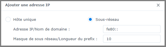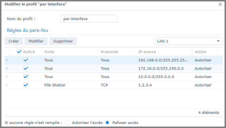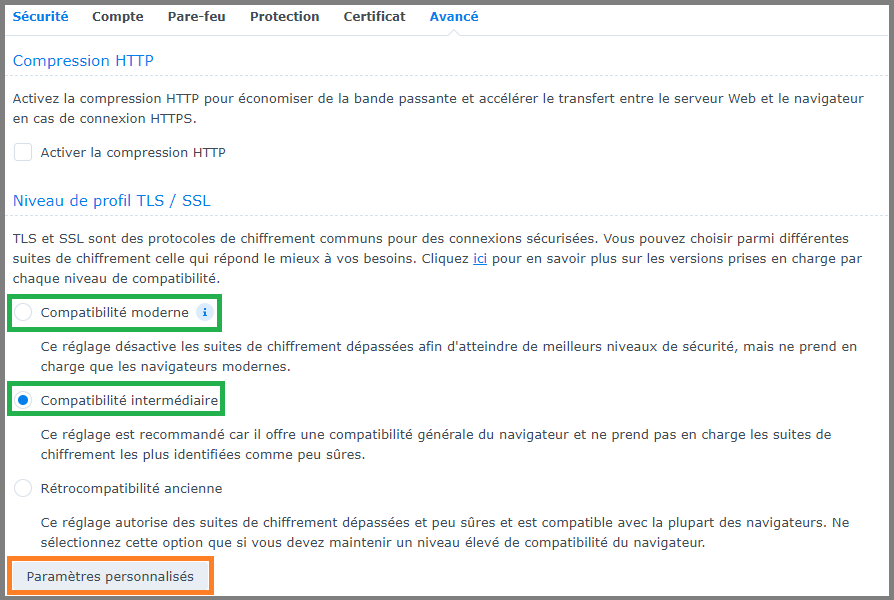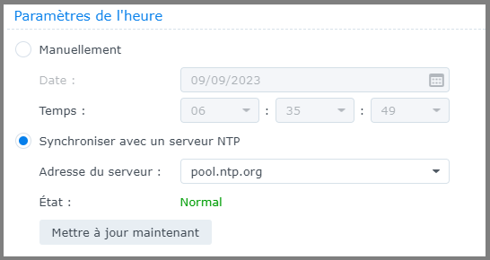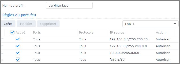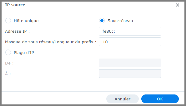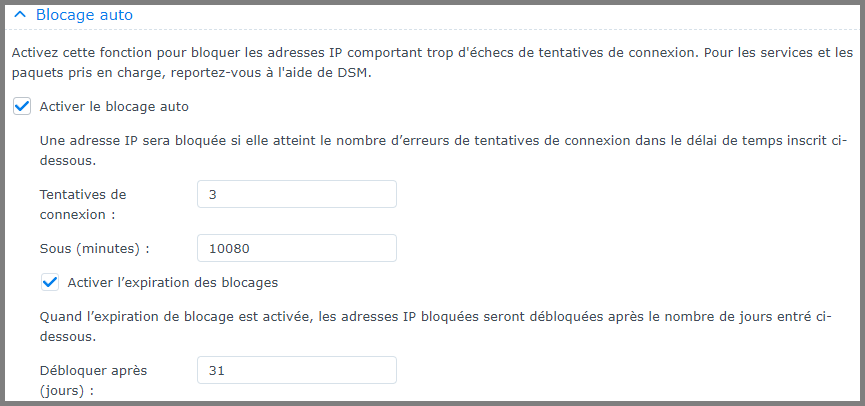 Pour qui ? Depuis plusieurs années, ce tutoriel rédigé par @Fenrir est LA référence en matière de sécurisation des accès à un NAS. C'est de loin le tutoriel le plus lu du forum, et c'est une bonne chose, car cela signifie que les utilisateurs de NAS Synology se préoccupent de sécuriser leurs données. Néanmoins, bien que le tutoriel soit toujours d'actualité, certaines sections de DSM sont organisées différemment depuis l'arrivée de DSM 7. En outre, certaines informations importantes se trouvent dans les innombrables pages de commentaires, ce qui ne facilite pas la tâche aux nouveaux venus. A l'usage, on remarque également qu'il peut : parfois aller trop vite sur certains points pour des néophytes être a contrario trop succinct pour des utilisateurs souhaitant aller plus loin dans la sécurisation des accès. Il a donc été convenu de rédiger deux versions du tutoriel : cette version, une version plus pas-à-pas, reprenant l'essentiel du tutoriel original, destinée à permettre une rapide mise en service d'un NAS de manière sécurisée. C'est l'objet du tutoriel que vous allez maintenant suivre. une version plus avancée, pour utilisateurs avertis Le tutoriel s'inspire grandement du tutoriel original, merci encore à @Fenrir son rédacteur. Préambule et recommandations Définition Mais commençons par un peu de vocabulaire, un produit labélisé NAS chez Synology est en réalité un serveur, disposant d'un OS, d'un processeur et de mémoire, permettant : La mise à disposition en réseau de données par de nombreux protocoles : HTTP, HTTPS, CIFS, NFS, SSH, etc... L'hébergement de services divers et variés : nativement (Centre de paquets) par conteneurisation (Container Manager) (plus d'info ici) par virtualisation (Virtual Machine Manager) Dans la suite du tutoriel, nous emploierons improprement le terme NAS par commodité. Cahier des charges Ce que ce tutoriel couvre : La configuration des protocoles utilisés pour les accès au NAS La configuration du pare-feu La mise en place d'un certificat TLS La configuration d'un service de notification La protection des accès utilisateurs La configuration des cartes réseau Ce que ce tutoriel ne couvre pas : La configuration de votre box pour un accès distant La mise en place d'un proxy inversé La mise en place d'un serveur VPN Le chiffrement de volume ou de dossier partagé La sauvegarde et la restauration de données (outre la configuration du système) // IMPORTANT \\ En appliquant ce tutoriel, vous coupez votre NAS de tout accès extérieur. Pour accéder à votre NAS à distance, il existe plusieurs méthodes : Utilisation du relais QuickConnect de Synology, point abordé dans la partie Accès externe. Accès par nom de domaine (point abordé dans la partie Accès externe également) + redirection de ports (avec ou sans proxy inversé) Utilisation d'un serveur VPN sur le NAS pour le transfert de fichiers uniquement : FTP, SFTP, WebDAV, etc... Veuillez vous référez aux liens fournis pour la mise en place d'un accès externe sécurisé. Prérequis et méthode Le vocabulaire dédié au monde du réseau est spécifique, il est conseillé de lire le sujet rédigé par @Kramlech, ces notions seront utiles pour la compréhension de la suite du tutoriel. De plus, ce tutoriel renverra vers d'autres tutoriels pour ceux qui souhaitent aller plus loin. Si une catégorie ou un onglet ne sont pas mentionnés, c'est qu'ils ne présentent pas d'intérêt dans le cadre de ce tutoriel. Lorsque des explications supplémentaires mais non nécessaires sont proposées, elles sont cachées dans des balises spoiler : Lisez ce tutoriel en diagonale une première fois pour avoir une vision globale des modifications que vous vous apprêtez à effectuer La plupart des fenêtres que vous ouvrirez dans DSM possède une aide intégrée, celle-ci est généralement bien documentée et traduite, cela vous permettra de connaître plus en détail les fonctionnalités offertes par les divers champs activables : Précautions Sauvegarde de la configuration Que vous veniez d'installer DSM sur votre NAS, ou que vous ayez déjà une instance de DSM en production, il est impératif de réaliser une sauvegarde de la configuration avant de commencer, pour cela, on va dans Démarrer -> Panneau de configuration -> Mise à jour et restauration -> Sauvegarde de configuration -> Exportation manuelle : Cliquez sur Exporter et sauvegarder le fichier sur votre ordinateur. En cas de problème, il sera possible de restaurer la configuration précédemment exportée en cliquant sur Restauration. J'ai tout cassé Si vous n'arrivez plus à avoir accès à votre NAS suite à un réglage effectué au cours du tutoriel, vous pouvez toujours effectuer un reset mode 1 du NAS. Celui-ci est suffisant dans l'extrême majorité des cas, et il a l'avantage de réinitialiser un nombre limité de réglages qui sont susceptibles de provoquer une perte d'accès à DSM. _________________________________________________________________________________________________________________________________________________________________________________________ Sécurité Cette section sera abordée plus en détail par après, mais dans un premier temps il est impératif de sécuriser les accès à votre NAS. Pare-feu - Accès locaux Par défaut, le pare-feu n'est pas activé, et donc tous les accès sont permis. L'idée générale est d'autoriser les accès depuis le réseau local, et de le fermer aux accès distants. Au fil des années, nous avons pu constater que la pratique habituelle de créer des règles pour toutes les interfaces pouvaient avoir des effets de bord indésirables, notamment dans le cadre de l'utilisation d'un serveur VPN, il est donc plus sécurisé de créer le minimum de règles pour chaque interface séparément. Et c'est la méthode que nous allons détailler. Pour configurer le pare-feu, il faut cocher Activer le pare-feu. Il est conseillé de laisser les notific