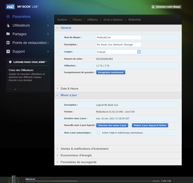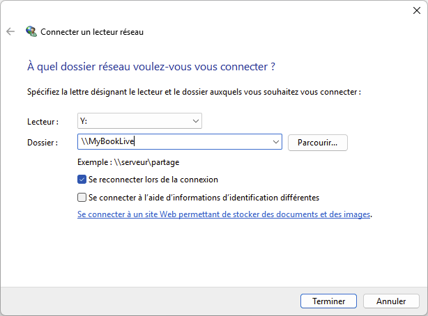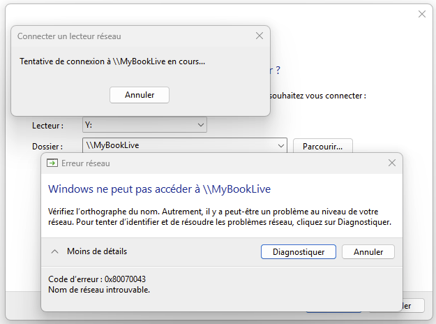 1. Bonjour, Mon PC, qui tourne sous Windows 11 pro 25H2, possède une carte mère MSI B550 Tomahawk, avec 2 ports ethernet. Sur le port 2,5 Gb, mon PC est relié à ma box internet. Sur le 2e port 1 Gb, j'ai connecté un MyBookLive de Western Digital. Il apparaît bien dans mes périphériques réseau : Lorsque je double-clique dessus, j'ai bien accès à sa console : Mais lorsque je veux connecter mon NAS avec son nom "MyBookLive" : J'ai un message d'erreur (0x80070043) : J'ai contacté le support de WD, qui m'a envoyé un lien avec plein de manipulations à faire, mais ça n'a rien changé. pour info, voici le lien : https://support-fr.wd.com/app/answers/detailweb/a_id/5509/initiator/user J'ai aussi tenté d'entrer l'adresse IP au lieu du nom "MyBookLive", mais ça n'a rien changé... J'ai réactivé aussi SMB 1.0, mais ça n'a rien changé. Quelqu'un aurait-il une idée d'où peut venir ce problème ou est-ce que je dois abandonner l'idée d'utiliser ce vieux NAS ? Merci par avance 🙂