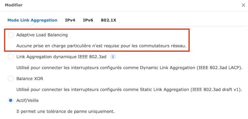 Bonjour, J'ai trouvé la solution par moi-même, j'avais ouvert un ticket chez AVM et après m'avoir donner quelques solutions rien ne fonctionnait et pour finir il m'on dit d'ouvrir un ticket chez Synology. En fait dans la Fritz!Box il y a un menu caché pour le service d'assistance technique ou il y a une fonction Accélération des paquets qui est activée par défaut, il suffit simplement de la désactivée et plus aucun soucis avec l'Adaptive Load Balancing ! Après plusieurs test effectué je n'ai pas non plus de perte de vitesse qui reste status-quo.