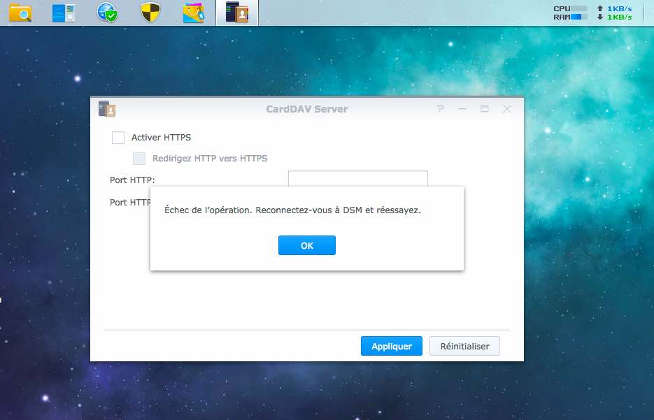 Je viens d'installer le paquet CardDav + Python module, mais impossible de le lancer, j'ai systématiquement le message : "Echec de l'opération. Reconnectez-vous à DSM et réessayer." (copie d'écran en pièce jointe)