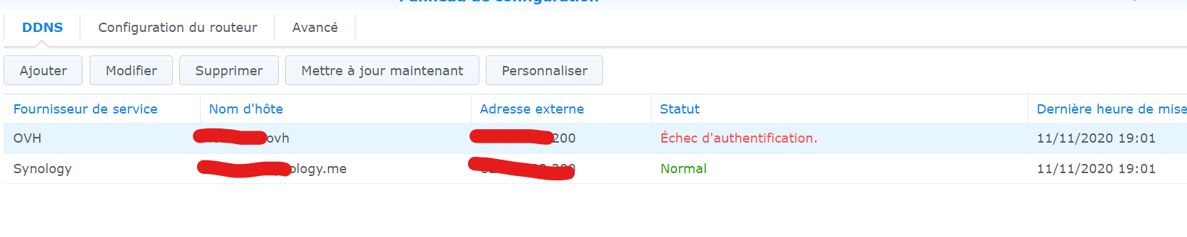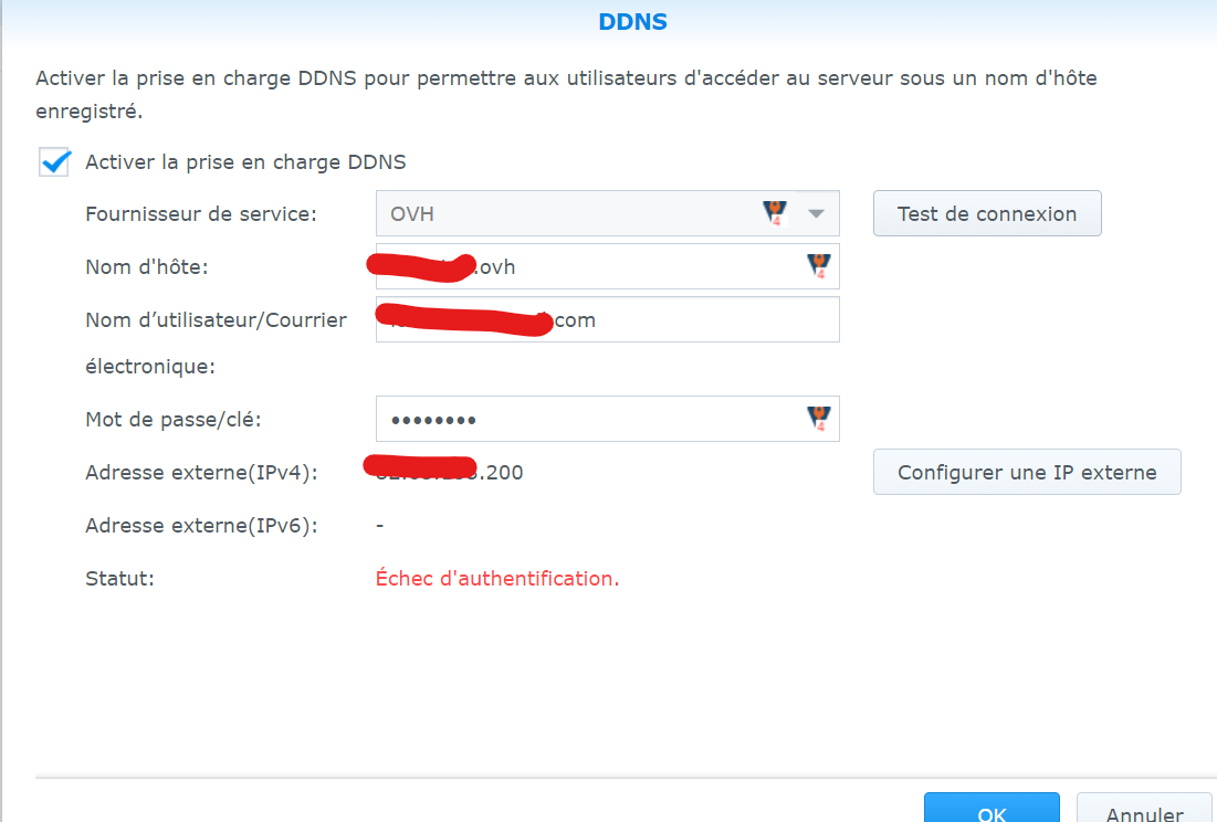 Malgré les relectures nombreuses des tuto, la connexion DDNS à ovh ne fonctionne pas. Mon DNS est pourtant valide et pointe correctement sur l'IP de ma box. Je ne comprends pas ce que j'ai mal paramétrer ???... J'ai "Echec d'authentification" qui s'affiche en permanence.