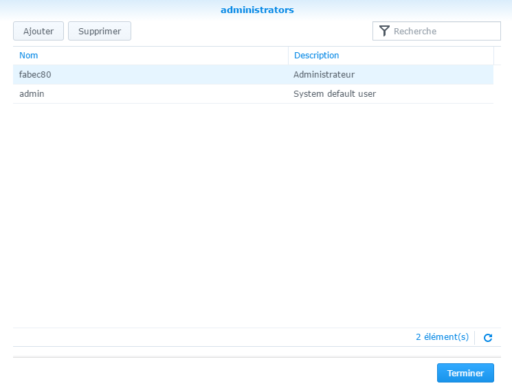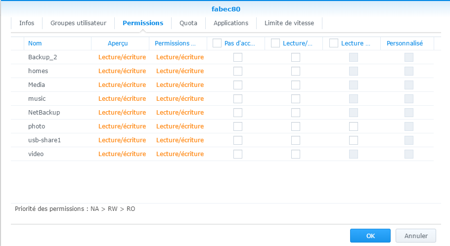 Pour votre info complémentaire, j'en ai aussi profité pour faire plusieurs captures précisant entre autres les permissions pour l'utilisateur fabec80 (moi-même) repris dans le groupe "administrators" et le message d'erreur renvoyé sur le DS216J (hyperbackup).