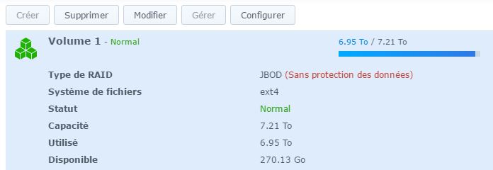 Dans tous les cas si tu as fait la conf de base du nas tu peux pas faire de JBOD maintenant. Je te conseille de crée un autre volume.