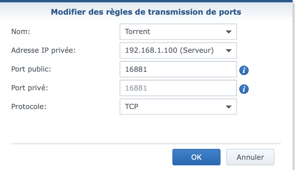 • bien valider les règles de NAT de mon routeur (port TCP 16881 et UDP 6881)