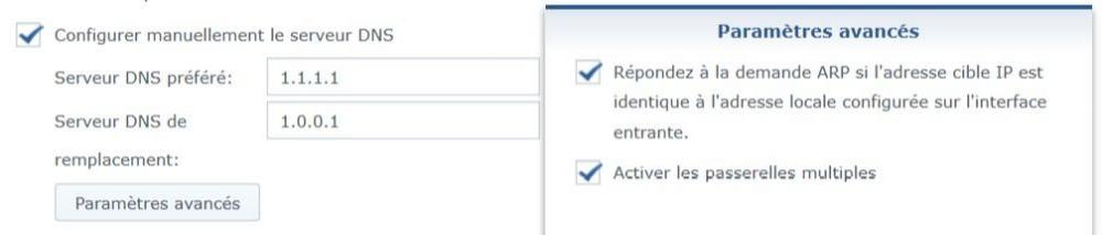 En plus des ports ci dessus, dans les options "réseau" sur le NAS, j'ai changé les DNS : Primaire 1.1.1.1 et Secondaire 1.0.0.1. Et activer les passerelles multiples.