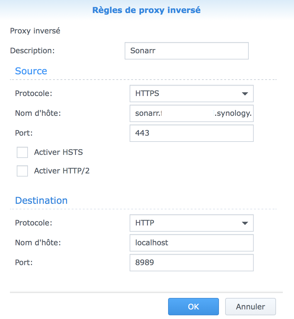 De plus, je souhaiterai accédé à mes container via une url direct du style https://blabla.synology.me/sonarr. Je pense que je dois faire ça avec un reverse proxy mais je ne sais pas du tout comment configuré cet élément. J'ai vu des autos sur le forum mais le plus important concerne DSM5 et je suis en DSM6 et ça me semple différent.