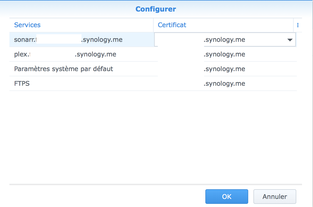 Pour que le certificat LE puisse couvrir vos noms de domaine, il faut IMPERATIVEMENT que TOUS les domaines soient listés dans le SAN. C'est ce qui correspond à la case "Autres noms" lors de la création du certificat. Mais pour cela, il faut que TOUS les domaines soient valides, ce qui ne peut en aucun cas être le cas de vos sonarr et plex qui sont des sous domaines synology.me non enregistrés.