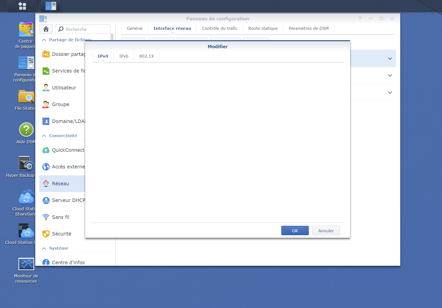Mon LAN est connecté (le NAS fonctionne bien) ; je clique sur "modifier" et là, la fenêtre "IPv4" reste désespérément vide (alors que les fenêtres "IP v6" et "802.1X" sont renseignées). Voir fichier joint.