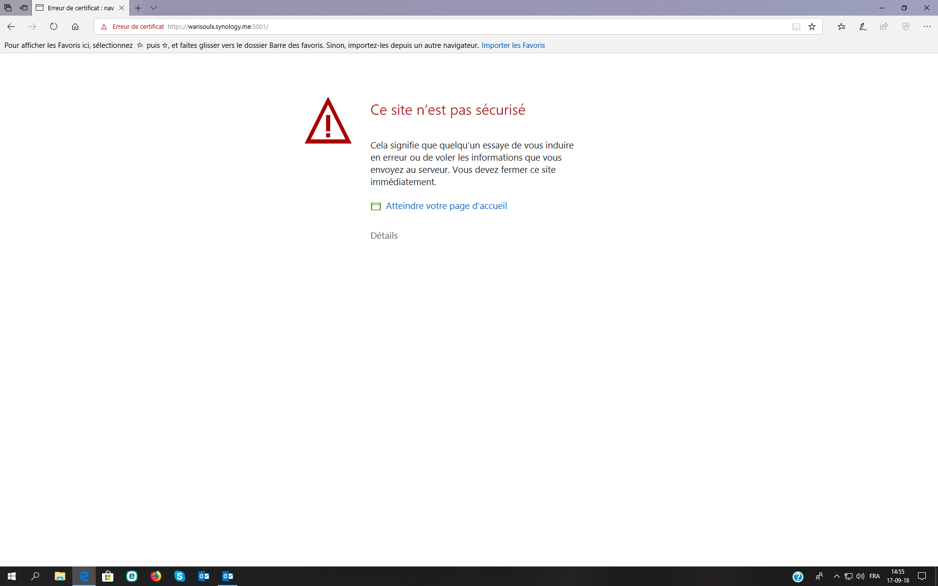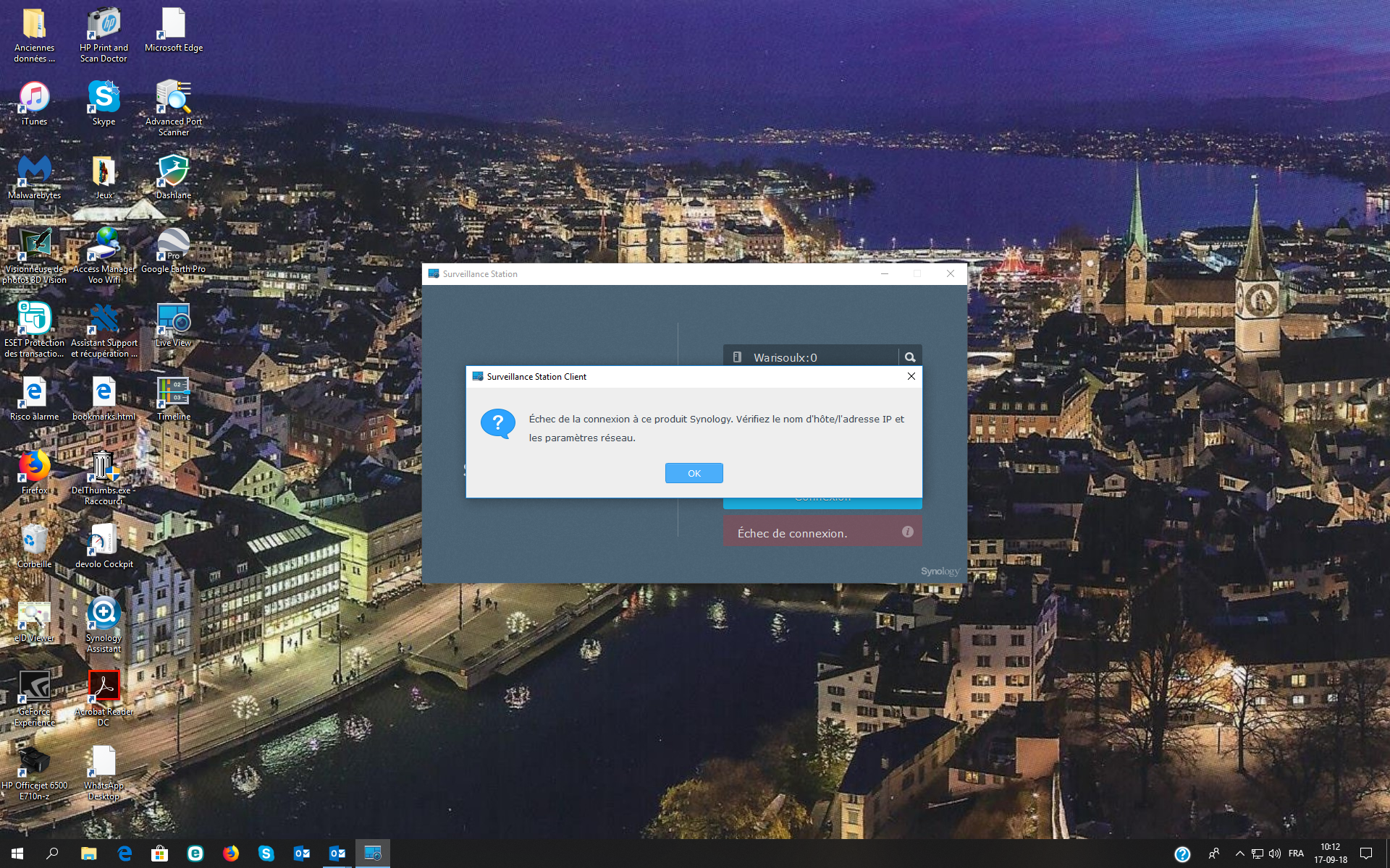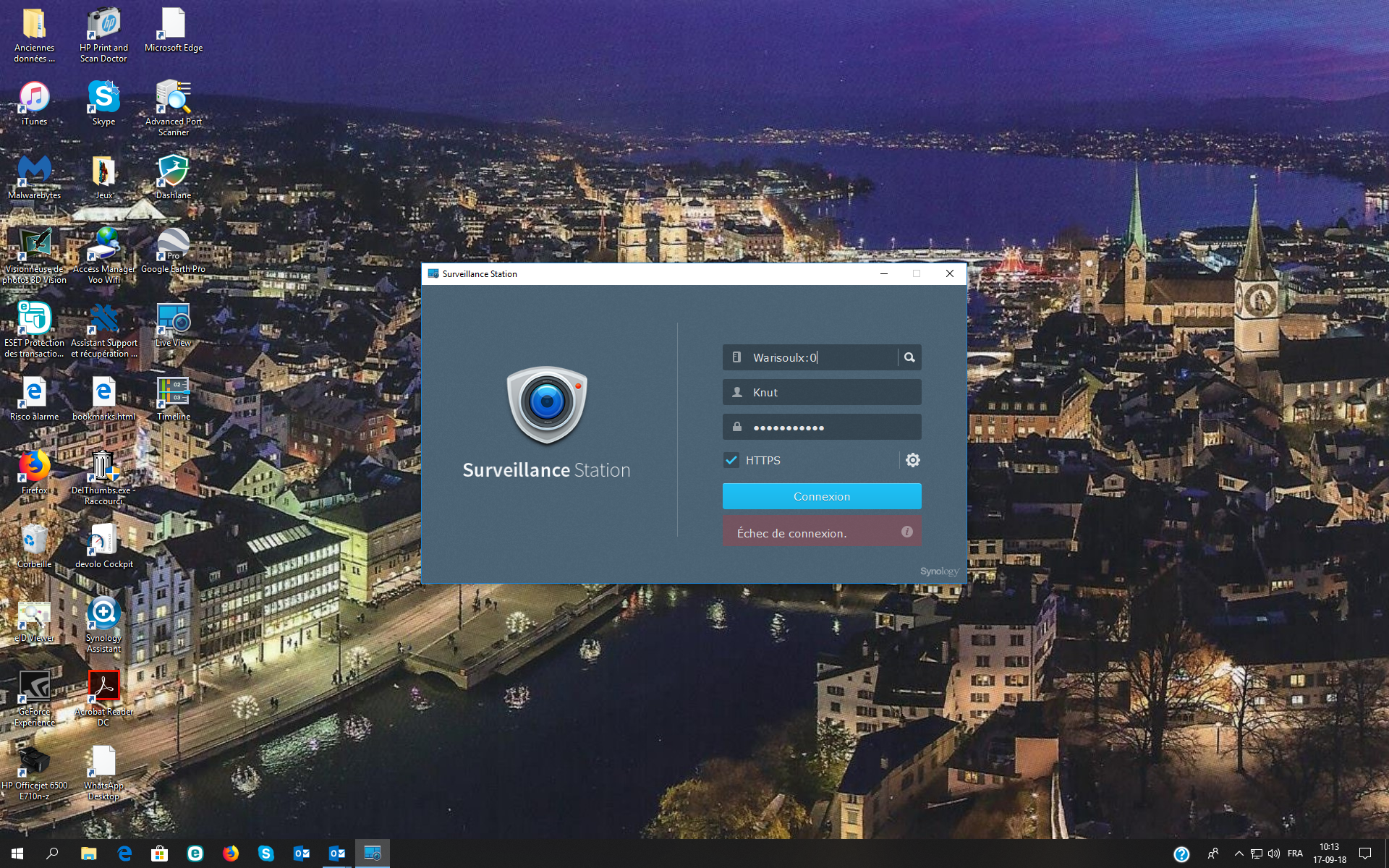 Je suis confronté avec le problème suivant: J'ai une DS216j avec 2 caméras connectés en filaire. Tout fonctionnait parfaitement. Depuis  hier, quand j'essaye d'ouvrir surveillance station, je reçois une info "échec de la connexion…" (voir copie screen en annexe). Ensuite, je constate que le nom du domaine a été légèrement modifié (par qui ?) en ajoutant ":O" (voir screen en annexe). Puis, j'ai essayé un accès via Quickconnect et je reçois le message "ce site n'est pas sécurisé" (voir copie screen en annexe).