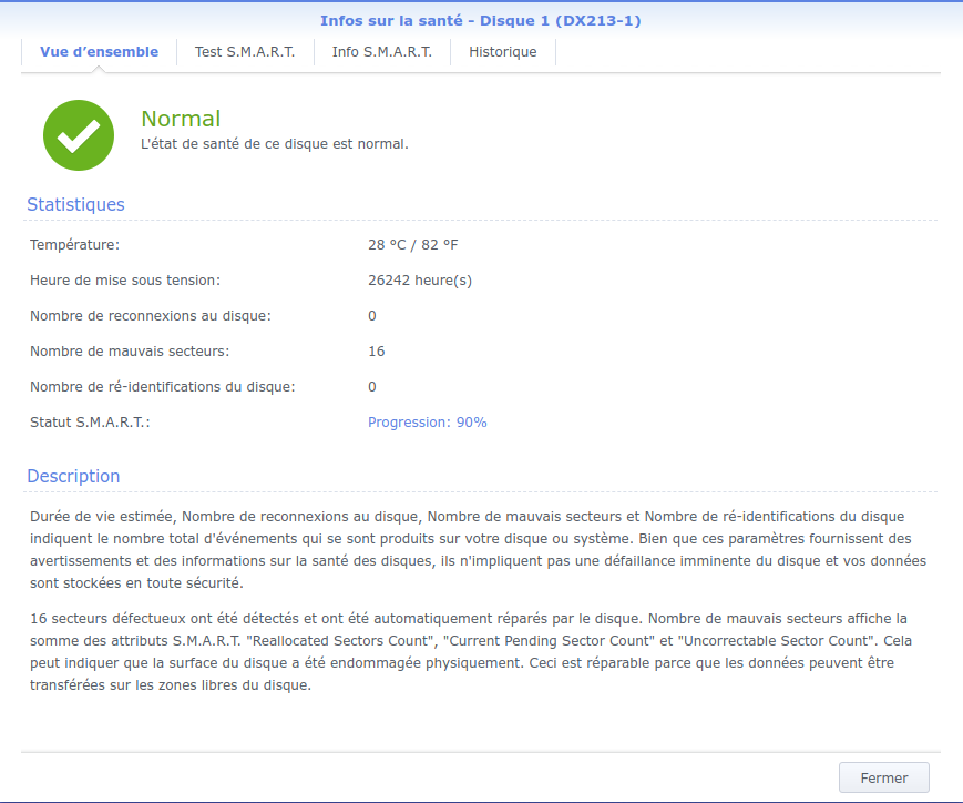 Le DSM dans la partie dédiée aux tests smart donne des recommandations et commente