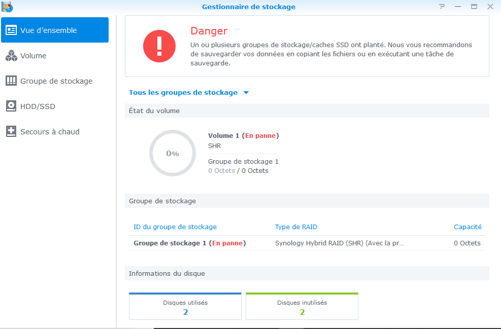 Depuis hier, notre NAS DS418j marque que le volume 1 est en panne. Du coup, nous n'avons plus accès aux fichiers hébergés sur celui-ci. Quelqu'un pourrait-il m'indiquer la procédure à suivre dans ce cas pour avoir de nouveaux accès aux fichiers?