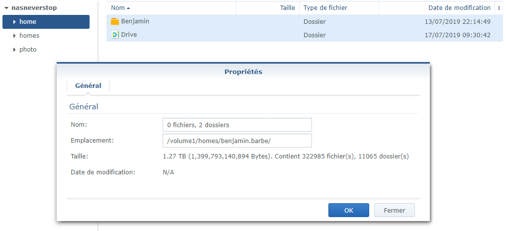La photo jointe montre le poids total de tout ce qu'il y a dans mon NAS (les deux premiers dossiers en racine de Home.)