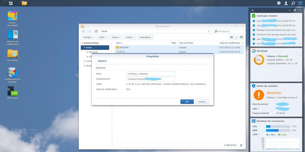 Je n'ai pas l'autorisation pour effectuer cette opération :/. Mais le problème c'est que c'est la même taille de fichiers que lorsque j'avais CloudStation. Malgré la seconde désinstallation du paquet, je n'ai pas retrouvé mes Go..