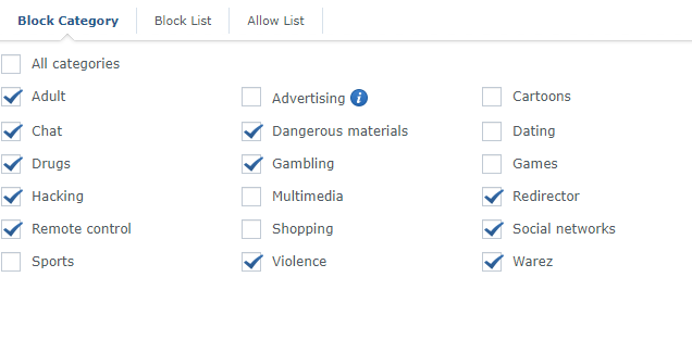 Effectivement en mettant le serveur DNS primaire sur le routeur et pas sur le NAS ça marche. Mais un truc m’étonne quand même quand je mets Netflix dans les sites bloqués il me le bloque bien effectivement, mais il ne bloque pas les catégories alors qu'elles sont bien affichées comme bloquées dans les messages du routeur.