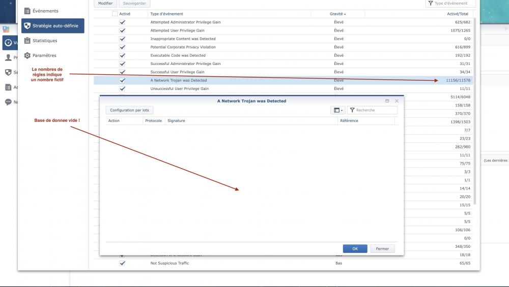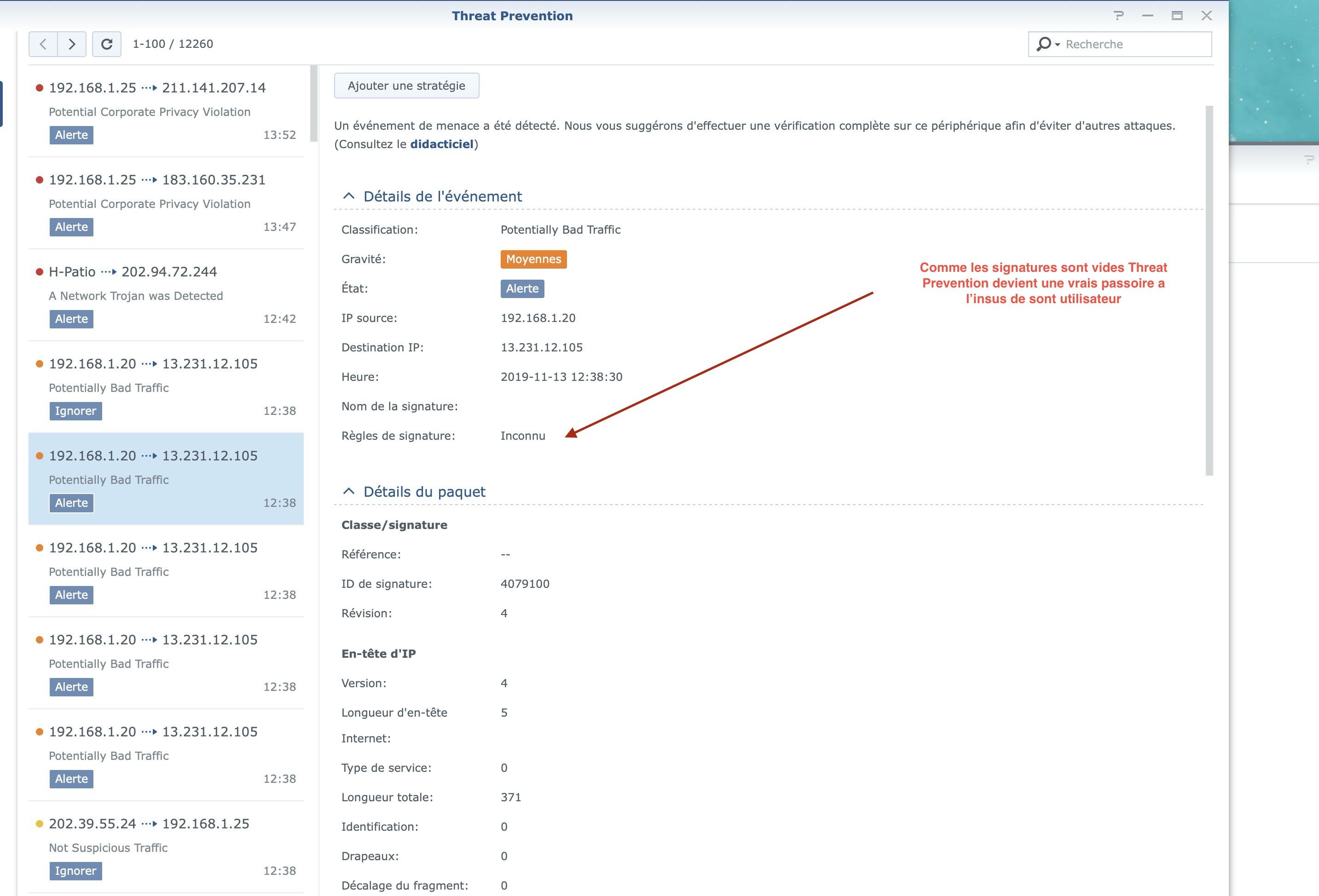 De plus Threat Prevention continu d'afficher que vous été bien protéger alors que se n'est plus le cas et parfois depuis très longtemps ! Ou alors comme pour le therme "ignorer" qui est utiliser pour dire en français "arrêter", Synology utilise le therme "Système bien protégé" pour dire  "Logiciel installé " !?