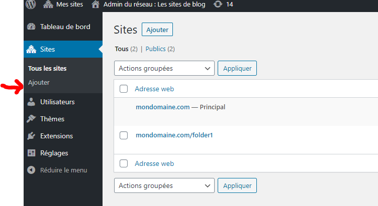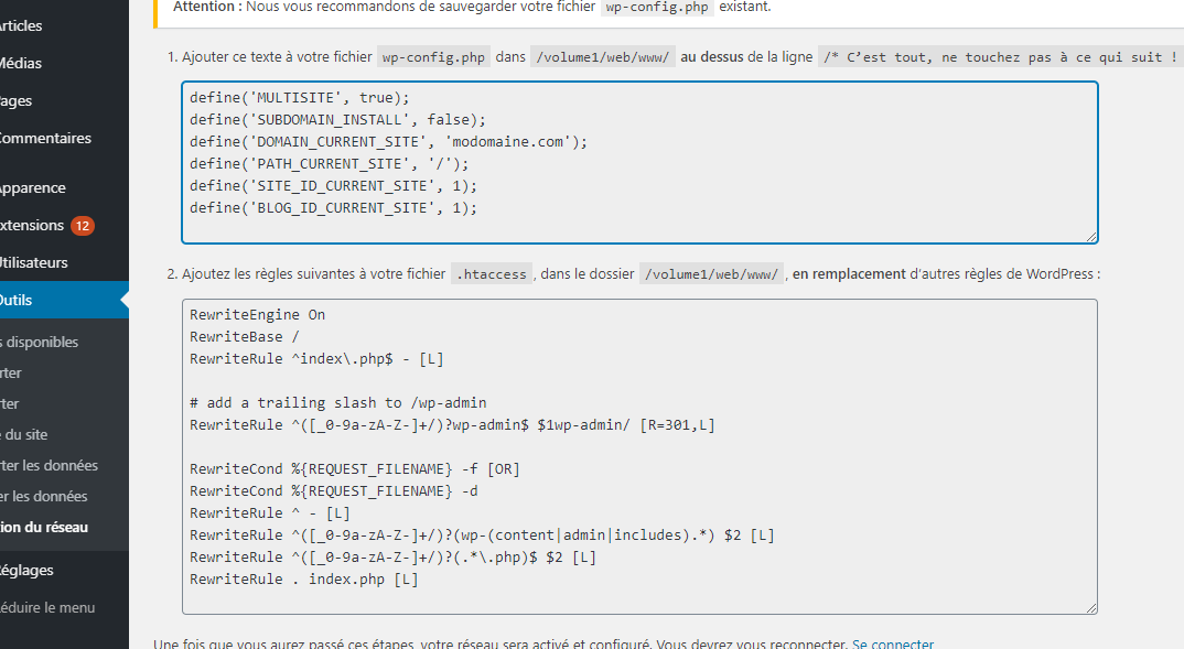Après modif' du wp-config.php, on a bien un nouveau sous-menu "Création du réseau" dans le menu "Outils"