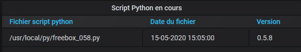 1. requete Grafana : SELECT last("nom_fichier"), last("last_updated"), last("version_script") FROM "freebox" WHERE ("tag1" = 'python') AND $timeFilter