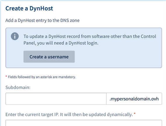 Pour mémoire, si tu avais créer ton DynDNS chez OVH en mettant une étoile " * " à la place de "quelquechose" dans le premier champ "sous-domaine" (pour le second tu laisses vide), ton DynDNS aurait été simplement "truc.fr" ce qui aurait été plus facile à l'usage car maintenant il te faut utiliser systématiquement "quelquechose.truc.fr" au lieu de simplement "truc.fr".