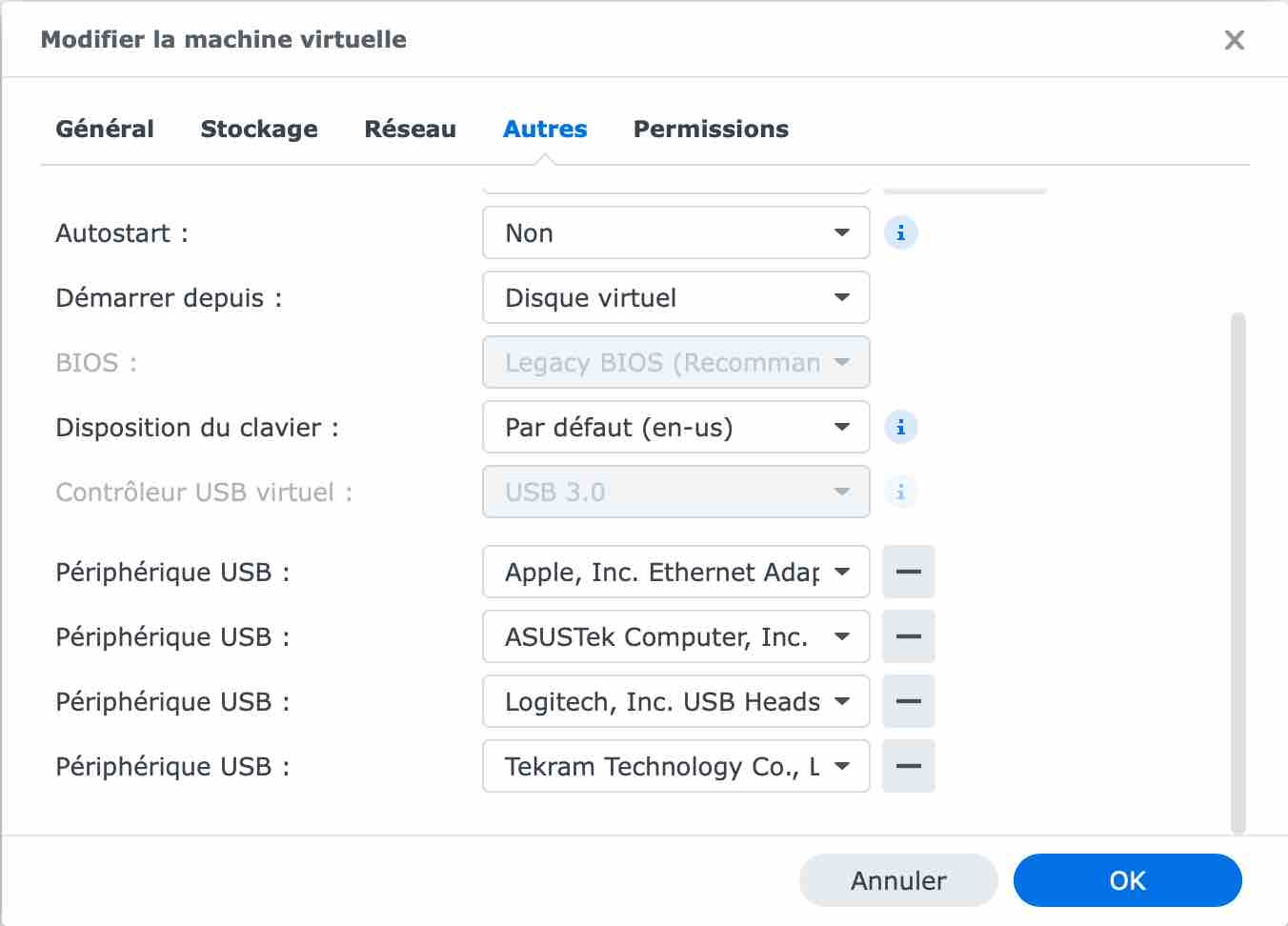 Dans une VM, peut importe si c'est compatible avec DSM (c'est comme ça pour tous les hôtes. Et quel serait l'intérêt de Synology de bloquer l'USB dans les VM?). Il faut juste que l'OS de la VM le supporte. ET bien sur ajouter le périphérique USB à la VM.