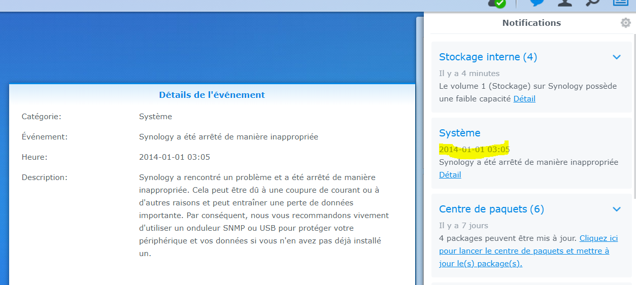 Je viens de réinstaller le NAS avec mes 2 alim ^^ donc j'arrive bien sur le DSM, ce qui me sueprend c'est l'erreur a une date au 01/01/2014 ::