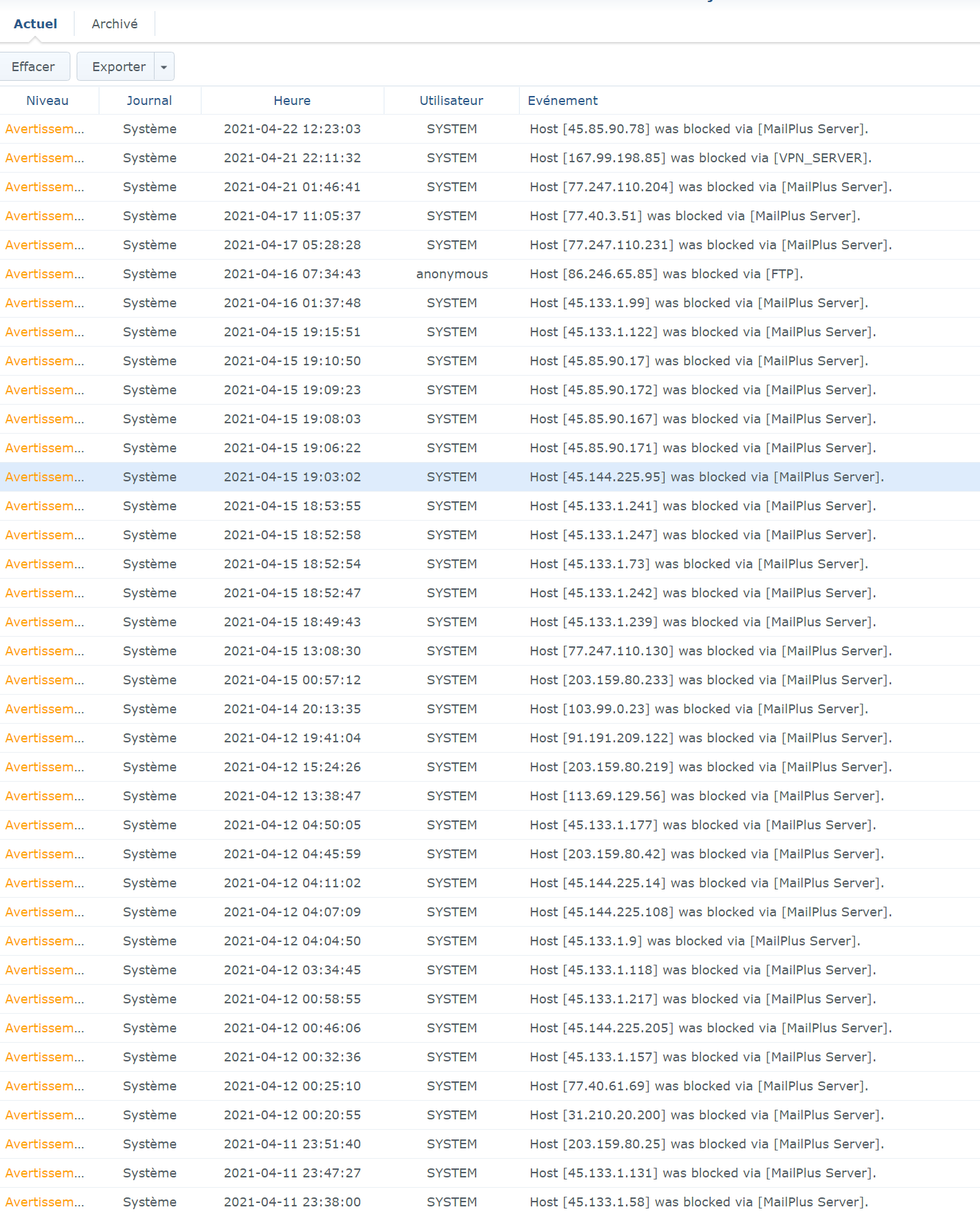 J'ai écrit à Synology pour leur demander qu'ils nous proposent très rapidement des règles de blocage supplémentaires comme bloquer des plages d'IP, mais quand cette fonctionnalité apparaîtra-t-elle... ? (Si nous étions plusieurs à faire la mm demande, sans doute cela accélérerait la prise de conscience...)