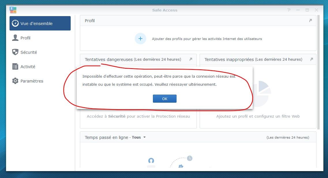 J'ai cherché sur le net et sur les forum mais la plupart des infos sont pour DSM ou n'ont pas fonctionné (Réinstall safeacces manuellement par exemple, DNS manuel en 8.8.8.8).