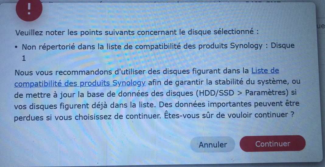 Du coup le message d’avertissement, c’est à prendre avec des pincettes et pour dédouaner Synology s’il y’a un problème de compatibilité avec les disques