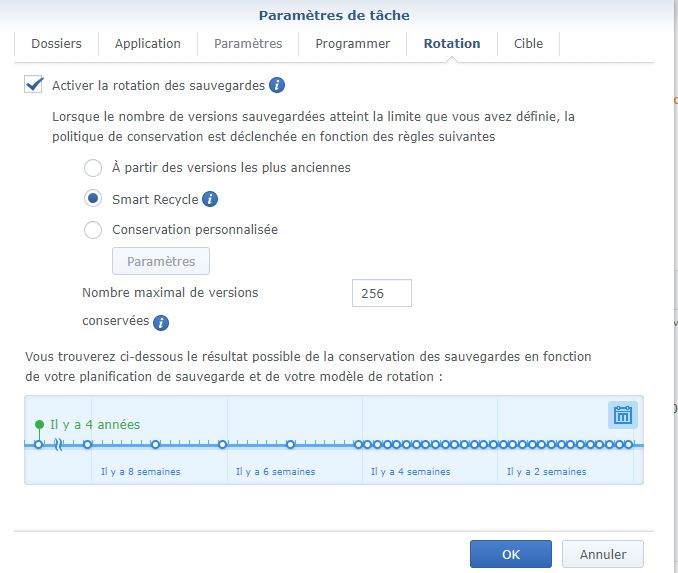 Je vous mets en pièces jointes les informations afin que vous pussiez voir notamment mon Hyper Backup avec 1 seule version à conserver vu qu'en plus c'est le mode "mono version" que j'ai choisi et qui est donc "simplifié" par rapport au mode normal d'Hyper Backup.