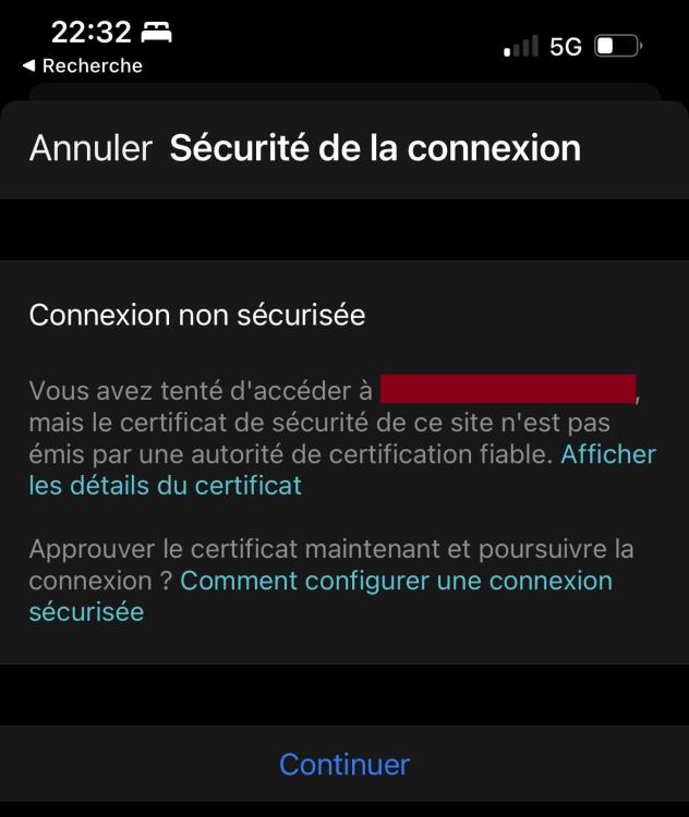 comme je fais tout ça de la maison, pour savoir si je peux accéder de l'extérieur, j'ai coupé le wifi sur mon téléphone et essaye avec la 4G. voilà ce que ça me dit ... mais je ne suis pas inquiète, pour l'instant je pense qu'avec les 4 règles configurées, comme c'est dit dans le tuto, tout est bloqué : c'est bien noté "Les règles ci-dessus n'autorisent que les réseaux locaux et bloquent tout le trafic venant d'Internet. "
