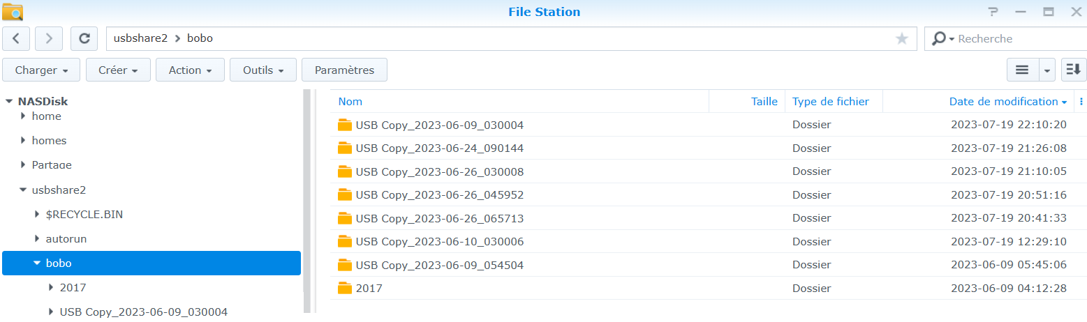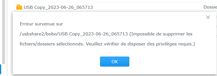 Le contexte est que j'utilise USB Copy pour sauvegarder le NAS sur un disque dur et parfois certains dossiers ou fichiers  (surtout des dossiers) ne sont plus accessibles en suppression par l'administrateur par manque de privilèges (Cf. image 4 ci-dessous en utilisant File Station); mais ils sont accessibles en lecture/écriture.