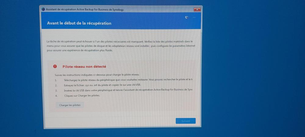 Lorsque je veux restaurer le disque système de mon ordinateur, à l'aide de l'outil de restauration Synology, un message d'erreur apparait comme quoi il manque les pilotes reseau.