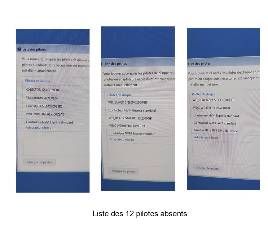 Je vous joint une photo de l'erreur qui apparait, avec la procédure à suivre pour la corriger, mais je ne m'en sors pas, ainsi qu'une autre photo avec la liste des matériels dont il doit manquer les pilotes, je pense qu'une étape a été oubliée lors de la création du média de récupération.