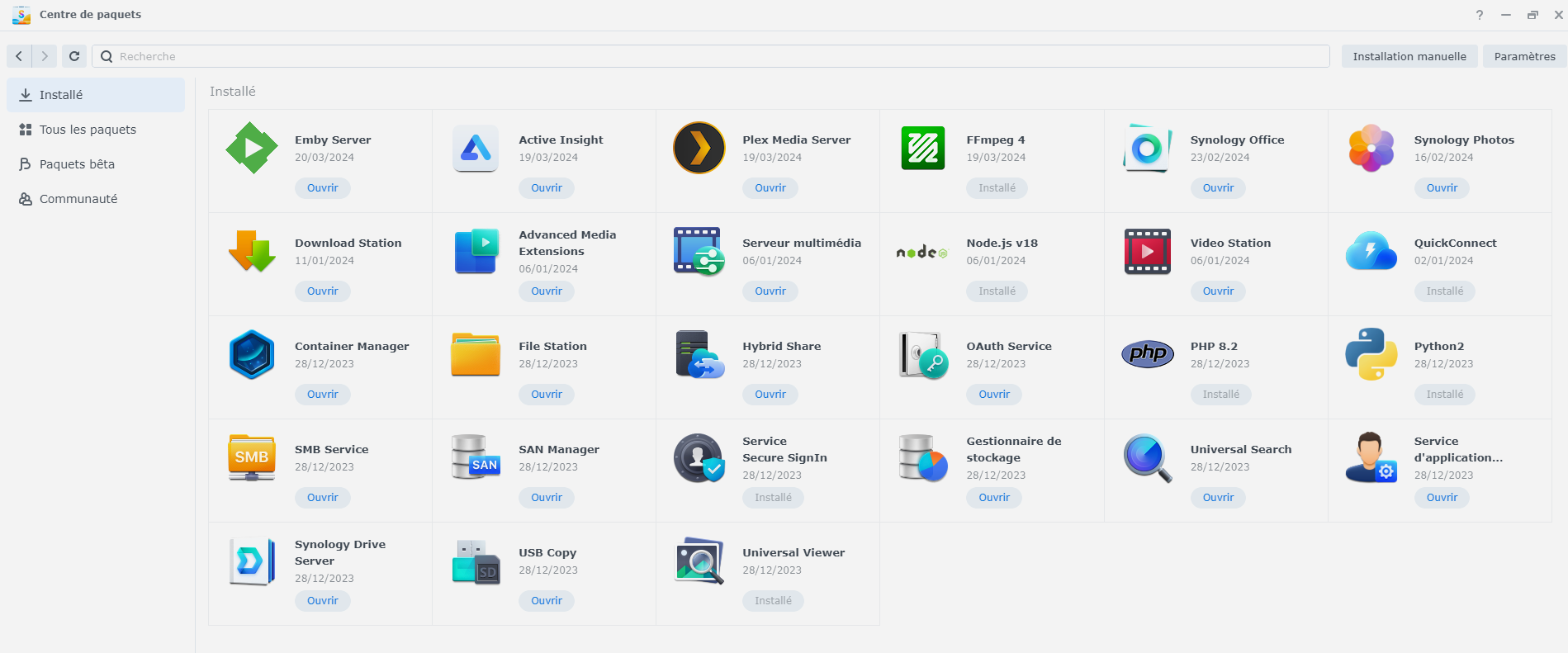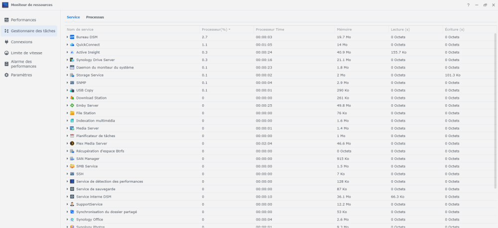 Quels paquets sont installés sur le NAS ? Quels processus consomment le plus de processeur/RAM ? (rubrique Gestionnaire de tâches)